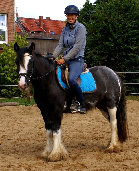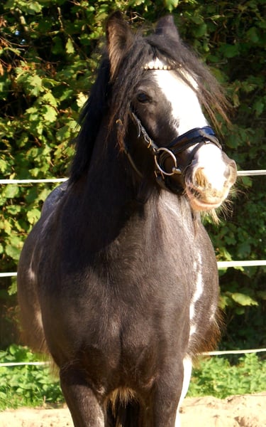 Knuffige black blagdon Tinkerstute, auffällige Optik mit schönem Exterieur, brav angeritten, hat Freude an Freispringen und springt auch mit toller Art, kennt Hunde und Traktoren, gibt brav Hufe, keine Rehe oder Mauke, artig im Umgang und unter dem Sattel
