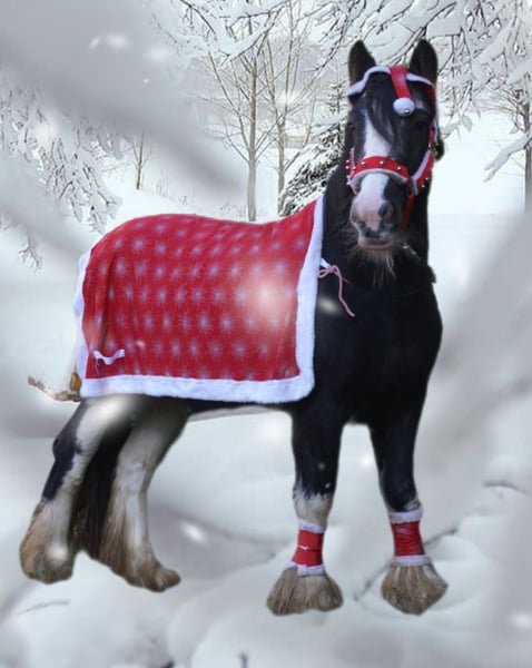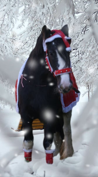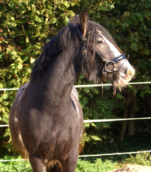 Adorable black Blagdon Tinker mare with striking appearance and beautiful conformation. Well-trained and calm under saddle, she enjoys free jumping and shows a great attitude while jumping. She is familiar with dogs and tractors, stands patiently for hoof care, and has no issues with lameness or mud fever. Well-behaved both on the ground and under saddle.