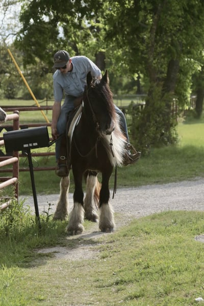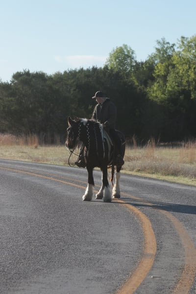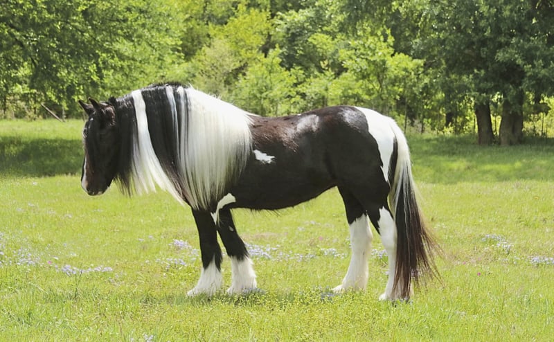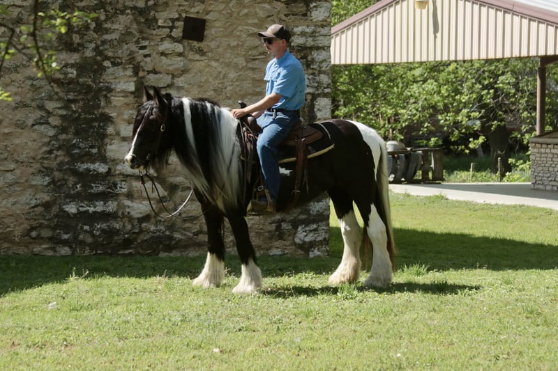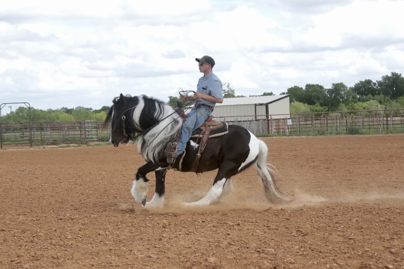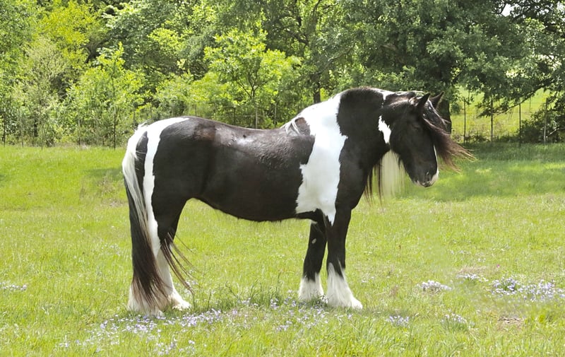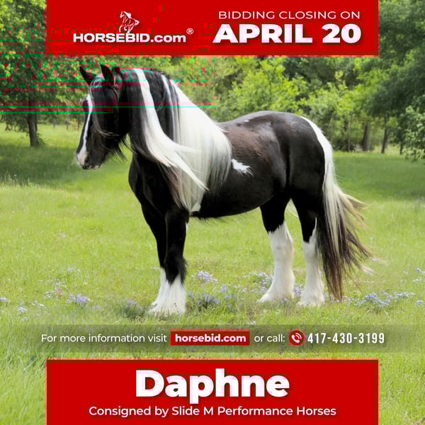 ⚜️𝐭𝐡𝐞 𝓔𝓵𝓲𝓽𝓮 𝐒𝐩𝐫𝐢𝐧𝐠 𝐂𝐥𝐚𝐬𝐬𝐢𝐜⚜️ Happening now thru MONDAY | APRIL 20th - Available EXCLUSIVELY on HorseBid's website! For more details and to register visit: www.Horsebid.com CONSIGNOR CONTACT: Slide M Performance Horses 417-430-3199 LOCATION: Dublin, TX BREED: Gypsy Vanner REGISTERED: No REGISTERED NAME: Daphne COLOR: Black and White Paint HEIGHT: 13.3 AGE: 5 GENDER: Mare Easily the most gentle horse we’ve ever had in our barn, Daphne is our go-to girl when we need something safe and reliable. Daphne is the kind of horse every family wants and needs—truly one for the whole family, from little kids to grandmas. Not only does Daphne have the classic black-and-white coloring, she also has a beautiful, thick mane and tail, along with feathering on her feet for that classic Gypsy Vanner look. This mare has an old soul and the kindest disposition. She meets you at the gate every day, ready for love and attention, and will put her head in the halter for you. Unlike most drafts, Daphne is very respectful on the ground and follows quietly while being led. She matches the pace of a slow handler, always being mindful of your space. Daphne will stand tied like a statue all day long to be brushed, fly-sprayed, saddled, bridled, shod, and bathed. You won’t hear a peep from Daphne, as she is not buddy-sour and not the type to holler for other horses. Daphne will walk out on the trails confidently with a herd or by herself, crossing mud, rivers, creeks, and going up and down steep, rocky hills without a wavering step. She has been trail ridden all over the U.S. She hauls great and doesn’t cause a fuss, loading into an open stock or slant trailer and backing out easily. On top of trail riding, Daphne has been ridden down county roads with passing cars, trucks, trailers, and wildlife, never blinking an eye at anything. Daphne is also a beautiful mover in the arena. She has a steady and controlled walk, trot, and lope, with a smooth stop and a cute turnaround. Daphne rides one- or two-handed and moves off leg pressure. You can also comfortably ride her bareback in a halter if that’s what you desire! This mare is truly the do-it-all type with the demeanor to match. From trail riding to arena work to obstacle patterns, she’s your go-to girl for all things and all ages. She is 100% sound with zero buck, kick, rear, or bite. She has clean, straight legs. PPEs welcome!