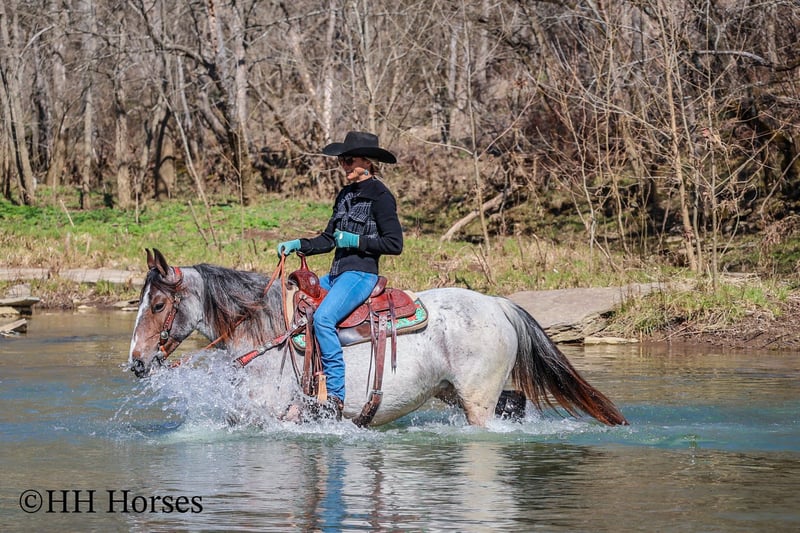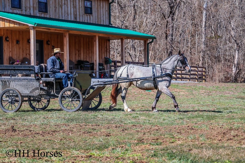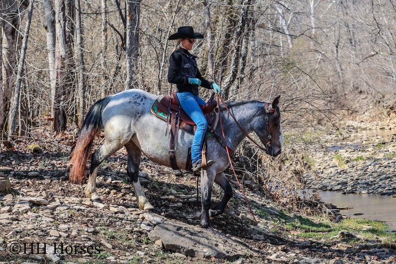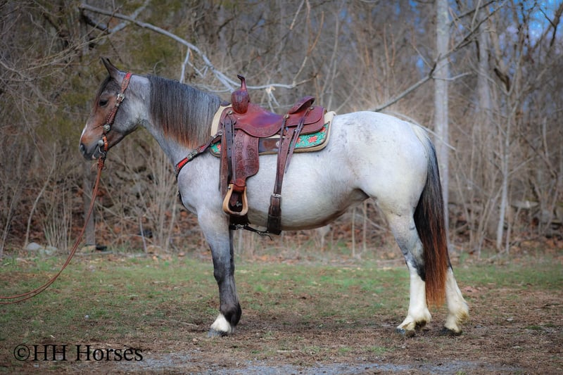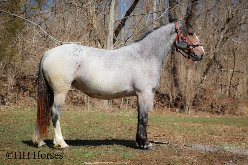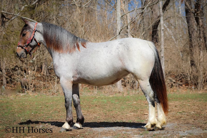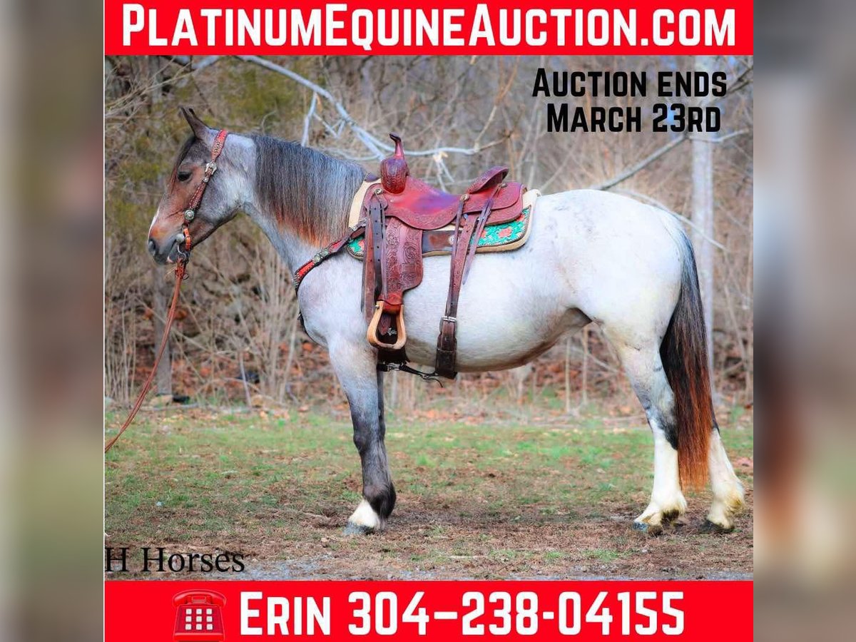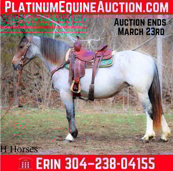 ONLINE AUCTION Place your bids at www.PlatinumEquineAuction.com Starting Bid $3500 Auction ends March 23rd, 2025 Need a new saddle? Check out White Rock Saddles on our website or Facebook! This is “GYPSY ROSE”, a very attractive, rare colored, well broke BAY ROAN GYPSY VANNER QUARTER HORSE crossbred mare that rides and drives. This mare is 5 years old and stands 14.1 hands tall. She is in foal to a Gypsy Vanner stallion for a June 2025 baby. She has had professional training and rides around like one should. She lopes nice collected circles, catches her leads, stops on whoa, backs up for any distance, and has a nice turnaround. This mare has been driven on the main roads and is traffic safe. She moves out with ease and is a very comfy ride that is attentive to her riders cues. She is responsive and fun with lots of feel. She will cross water quietly under harness or tack. This mare has been through the cross country driving courses. She will trail ride anywhere you want to go bravely. She has been used out in the pastures to gather cattle and driven to church on Sundays. She is versatile, well trained, smart, cool colored, and going to have a Gypsy foal soon. She is the right size, has the right temperament, and is a unique find with her color. She stands to harness, hitch, tack, mount, and groom. Don’t miss out on a fun 2 for 1 opportunity. Located in Flemingsburg, KY. For more info or to make a Buy It Now Offer contact HH Horses Erin 304-238-4155. ONLINE AUCTION Place your bids at www.PlatinumEquineAuction.com Starting Bid $3500 Auction ends March 23rd, 2025 Need a new saddle? Check out White Rock Saddles on our website or Facebook!