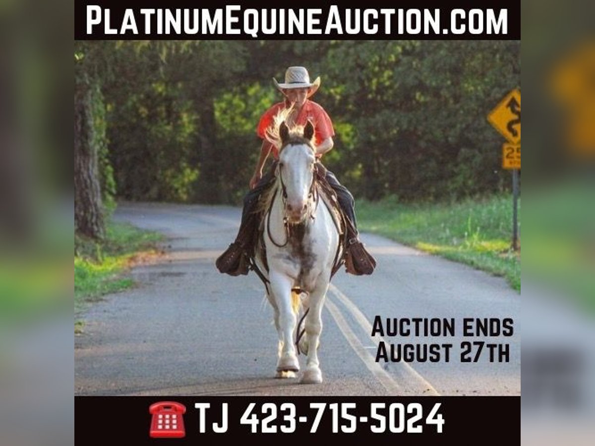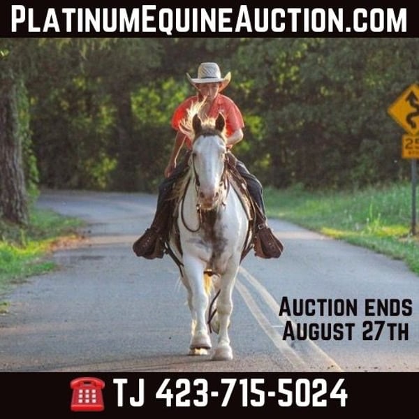 ONLINE AUCTION Place your bids at www.PlatinumEquineAuction.com Starting Bid $3500 Auction ends August 25th, 2024 Need a new saddle? Check out White Rock Saddles on our website or Facebook! Finnigan is a 8 year old super cool Gypsy Vanner X Quarter Horse cross gelding. He’s been used penning cattle at a feed yard. He has a very nice handle! Finnigan has a good walk and he can cover a lot of ground. He stands only 14 hands tall and he is wide as he is tall! Super safe and gentle. No buck ,rear or bite about this dude! Stands tied with out a fuss and he loves a bath! Call for any additional information TC Cattle Co. TJ 423-715-5024 Located in Cleveland, TN. ONLINE AUCTION Place your bids at www.PlatinumEquineAuction.com Starting Bid $3500 Auction ends August 25th, 2024 Need a new saddle? Check out White Rock Saddles on our website or Facebook!
