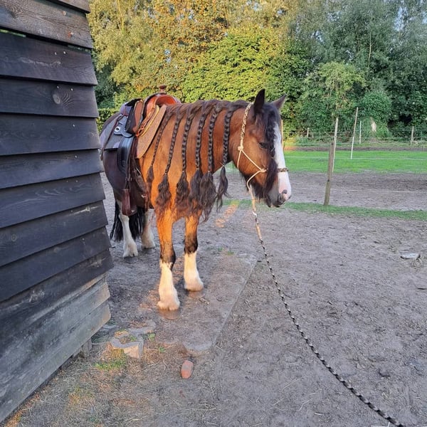 16 jaar en 144cm. heb een alleskunner kan een sprongetje dressuur beetje western en vind bos mega leuk. tinker met gouden hart kan met iedereen om. Zoek iemand die nog veel plezier met hem wil hebben. En grondwerk en bosritten ook erg leuk vind.