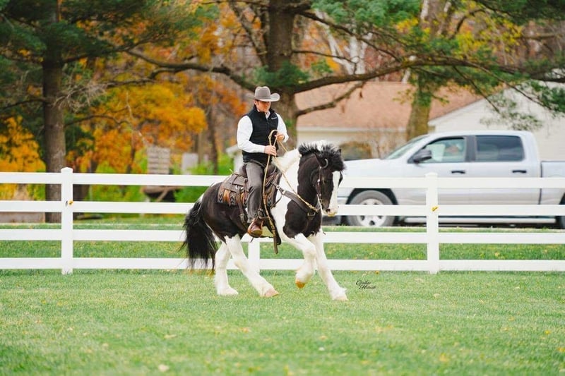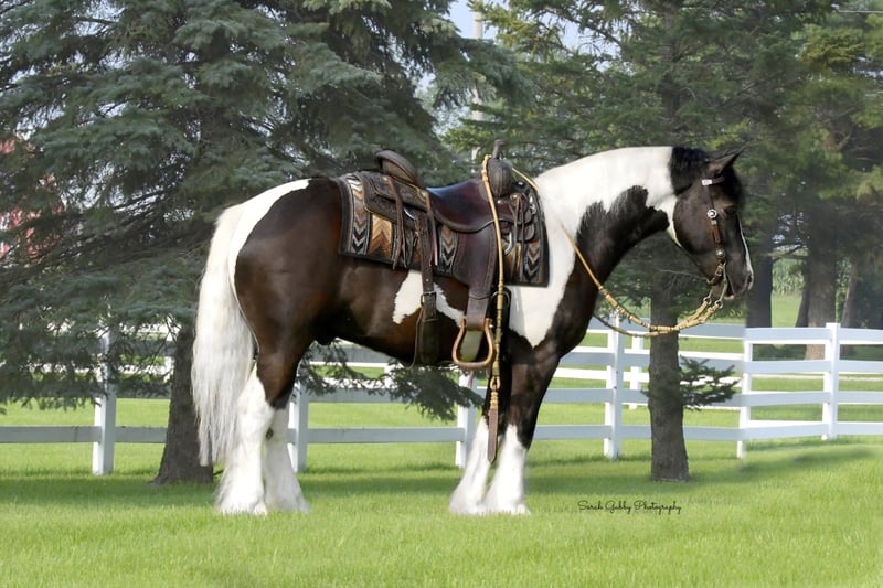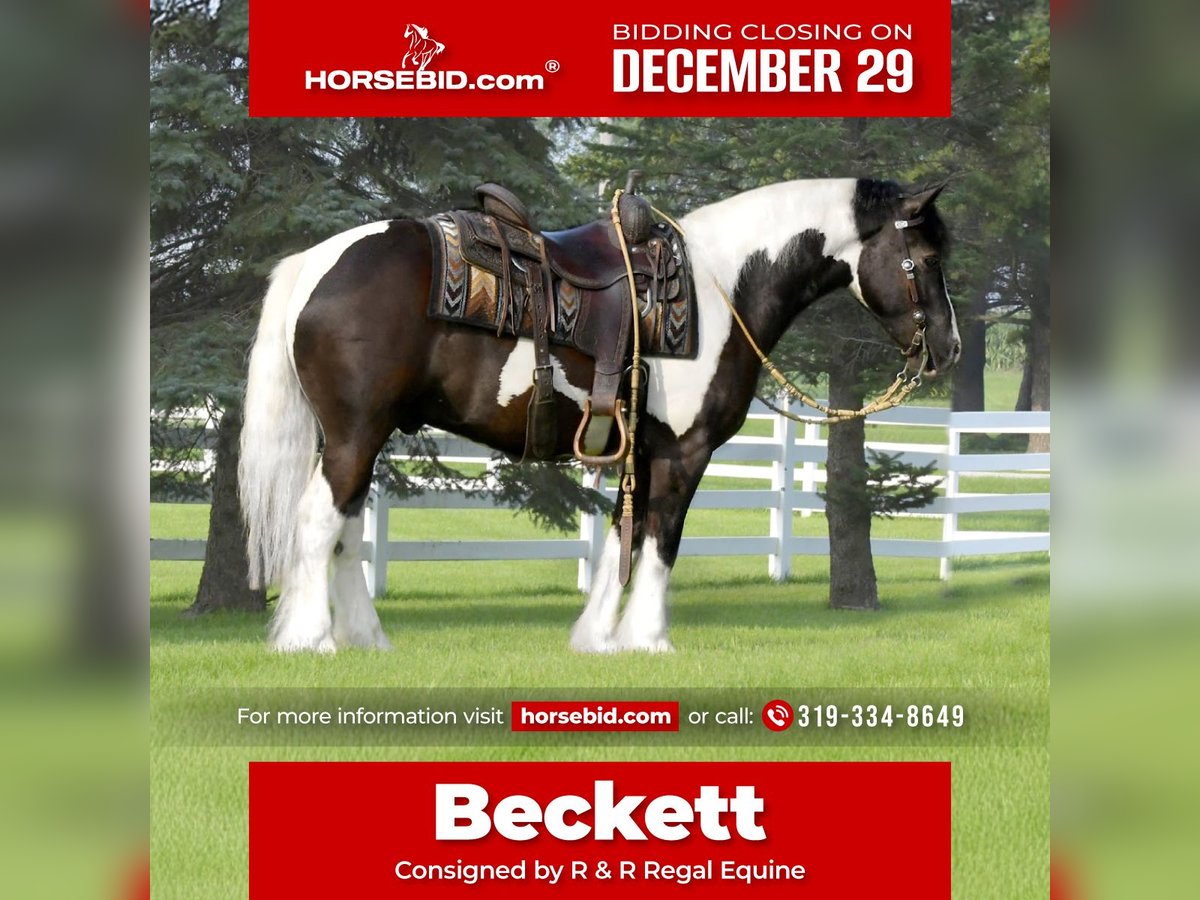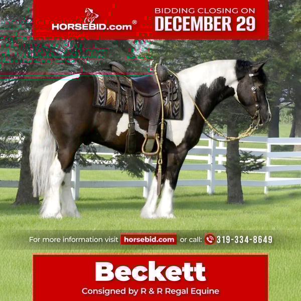 ⚜️ 𝓗𝓮𝓻𝓲𝓽𝓪𝓰𝓮 𝐖𝐢𝐧𝐭𝐞𝐫 𝓒𝓵𝓪𝓼𝓼𝓲𝓬⚜️ Happening now thru MONDAY | DECEMBER 29th - Available EXCLUSIVELY on HorseBid's website! For more details and to register visit: www.Horsebid.com CONSIGNOR CONTACT: R & R Regal Equine 319-334-8649 LOCATION: Independence IA BREED: Gypsy Vanner Haflinger Cross REGISTERED: No COLOR: Black and White Tobiano HEIGHT: 14 AGE: 4 GENDER: Gelding Beckett is a striking 2022 model, 14-hand black and white Gypsy Vanner / Haflinger cross gelding with both beauty and versatility. He is well started under saddle and in harness, confidently trained to ride and drive. Under saddle, Beckett goes English and Western, showing a willing, cooperative attitude and a smooth way of going. He has a solid foundation for his age and continues to progress nicely with regular work. Beckett is an eye-catching gelding with a sturdy build, good bone, and the attractive coloring and presence that turn heads wherever he goes. His cross brings together the calm, people-oriented nature of the Gypsy Vanner with the strength and work ethic of the Haflinger. He is responsive to his rider, learns quickly, and enjoys having a job, making him suitable for a variety of uses—from pleasure riding and driving to further training in the discipline of your choice. He would be a great fit for someone looking for a young, versatile gelding with a kind demeanor and lots of potential. He can be registered with GHRA