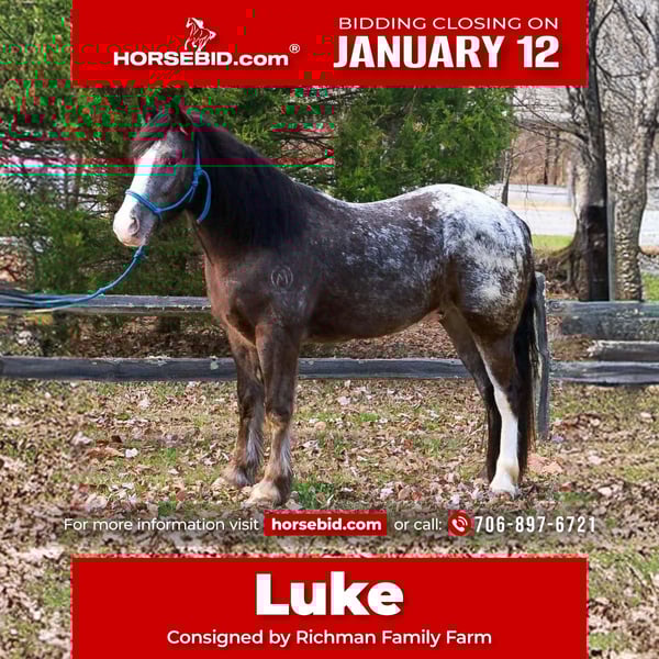 ♦️𝐍𝐄𝐖 𝐘𝐄𝐀𝐑'𝐒 𝑬𝒙𝒕𝒓𝒂𝒗𝒂𝒈𝒂𝒏𝒛𝒂♦️ Happening now thru MONDAY | JANUARY 12th - Available EXCLUSIVELY on HorseBid's website! For more details and to register visit: www.Horsebid.com CONSIGNOR CONTACT: Richman Family Farm 706-897-6721 LOCATION: Blairsville, GA BREED: Gypsy/appaloosa cross REGISTERED: No REGISTERED NAME: Romero’s cool hand luke COLOR: Black-n-white HEIGHT: 14.3 AGE: 4 GENDER: Gelding “Luke” is a stunning 4 year old Gypsy/Appaloosa cross gelding standing at 14.3hh. He sells with Gypsy Horse Association application, already filled out, and ready for you to send in. He has a super sweet in your pocket type demeanor. I bought this horse in early 2025, he’s been my personal horse all year. I have been all over the North Ga mountains, and he is as sure footed as they come. He lopes beautiful circles in the arena, and takes both leads with ease. Side passes and has a comfortable W/T/C. You’ll absolutely love his lope when you’re out enjoying a relaxing trail ride. He’s also been through Mounted Patrol Training and handled that like a pro. Luke is truly one of a kind not only in breed, but in color, looks, attitude, training, affection, and the list goes on and on. I’m going to offer a 7 day guarantee on Luke. He’ll come utd on everything and we can help with delivery too. If you need any info at all, don’t hesitate to call or text…706-897-6721