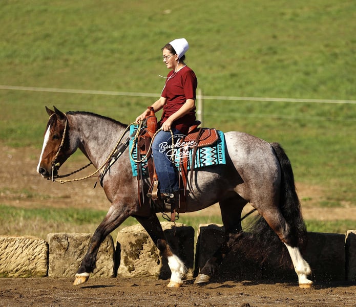 What a sweet individual we have to offer you! Rusty truly lives up to his name — that rich red roan coat gleams like polished copper, giving him the warm, “rusty” glow that makes him stand out wherever he goes. His size, color, and personality do not come around very often, and it is easy to see why everyone falls in love with him. Rusty is a 2021 model Gypsy/Quarter Horse cross standing at that just-right size of 14.3 hands. He has built to last with correct conformation, a kind eye, a thick bushy tail, two white socks, and a striking white blaze that completes his handsome look. From the moment you meet him, Rusty’s sweet and gentle nature shines through. He is the first to meet you at the gate, ears forward and waiting for a good scratch or a pat on the neck. He loves people, enjoys being brushed and fussed over, and is always eager to please. He has that calm, old soul personality that is hard to find — confident, patient, and kind, whether you are on his back or simply standing by his side. Rusty has been ridden Western, English, and bareback. He is just as happy working in the indoor or outdoor arena as he is out exploring new trails. He has been on countless miles through the woods, across creeks, over logs, up and down hills — taking it all in stride, sure-footed and steady every step of the way. Rusty is the kind of horse that does not get in a hurry but will move out willingly when asked. He is smooth, balanced, and dependable, making every ride a relaxing and enjoyable experience. Whether you want a quiet companion for a relaxed trail ride, a dependable partner to take down the road, or a fun, versatile horse to enjoy in the arena, Rusty fits the bill. He side-passes to make mounting easy, knows his leads, and moves willingly off leg pressure. His walk, trot, and canter are all smooth and easy to ride — you can sit him all day without getting tired. He rides with a nice, soft one-hand neck rein and stays quiet under saddle no matter what you are doing. Rusty has been exposed to about everything he is desensitized to tarps, jugs, gunshots, and whips. He has been on state roads and through traffic, staying calm and steady. He has even learned a few fun tricks, like laying down and sitting up on command, showing just how intelligent and willing he is. He is great with kids, loves attention, and does not require daily riding to stay the same. Give him a few days or even a few weeks off, and you can saddle up and go — he will be the same sweet, dependable gelding every time. Rusty is up to date on all his deworming, vaccinations, and shoeing. He is one of those rare horses that truly has it all — the looks, the build, the color, and the mind to match. If you have been looking for a loyal partner who is as honest as the day is long, Rusty is ready to meet you at the gate with his big heart and quiet confidence. If this sounds like the horse that you have been looking for, please feel free to reach out to Duane @ 330-231-2324 for more information or to meet him in person.