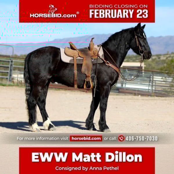 💎 𝐓𝐇𝐄 𝓓𝓲𝓪𝓶𝓸𝓷𝓭 𝐒𝐇𝐎𝐖𝐂𝐀𝐒𝐄 💎 Happening now thru MONDAY | FEBRUARY 23rd - Available EXCLUSIVELY on HorseBid's website! For more details and to register visit: www.Horsebid.com CONSIGNOR CONTACT: Anna Pethel 406-750-7030 LOCATION: Wickenburg, AZ BREED: Gypsy Vanner Cross REGISTERED: Yes REGISTERED NAME: EWW MATT DILLON COLOR: Black HEIGHT: 15 AGE: 4 GENDER: Gelding Eww Matt Dillon Bonanza is a coming 4 year old Gypsy Gelding. He has been ridden consistently the past 6 months. Walk, trot, lope, stop, side pass, has a nice turn around. Bonanza is a beautiful mover and trots out effortlessly. He has an incredibly smooth lope. He is not your typical lazy gypsy. He loves having a job. He has the energy to go all day and would make a great ranch horse or winter project for someone. He has been ridden in the arena, down the road with traffic, down the trail, in the mountains, and out in the desert. Bonanza has been through water, drug a log, trotted ground poles and even gone through the barrels and poles. Bonanza has even been used to sort cows out on the ranch. He loads and unloads in and out of the trailer. Has been hauled 1000s of miles and handled it well. He eats and drinks on the road like a champ. He is still young. He lacks confidence and is a more sensitive horse. He is not a kids horse. He is best suited for an experienced rider and someone who can work with him consistently. He gets better everyday and wants to please. We have loved having Bonanza and his goofy personality. We hope he can find a loving, forever home. Please reach out with any further questions or to schedule a time to come check him out. He is currently located in Wickenburg, AZ.