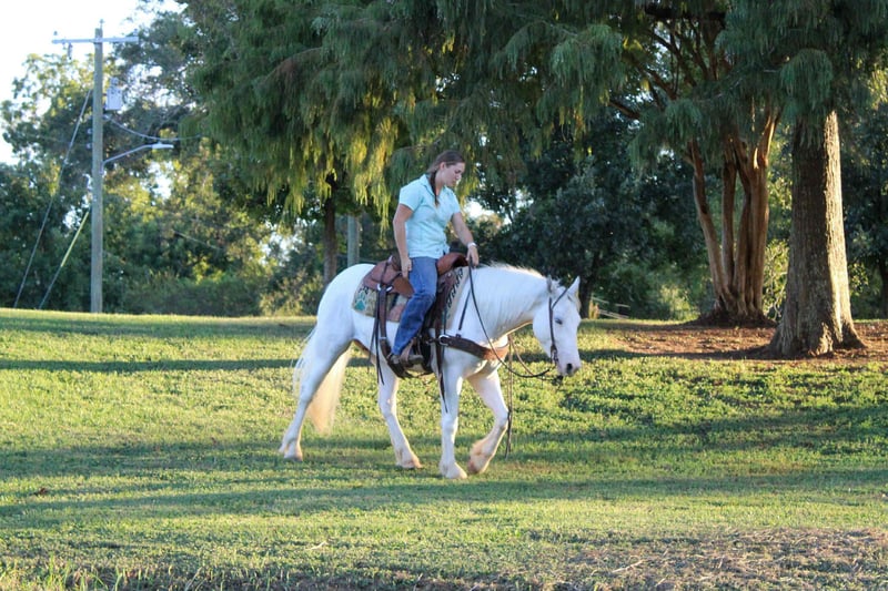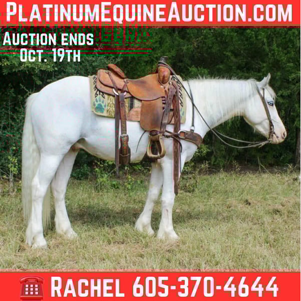 ONLINE AUCTION Place your bids at www.PlatinumEquineAuction.com Starting Bid $3500 Auction ends October 19th, 2025 Need a new saddle? Check out White Rock Saddles on our website or Facebook Marshmallow is an adorable 4 year old gray and white paint Gypsy/pony cross gelding. He stands 14 hands tall, with a long mane and tail, feathered feet, and one blue eye he is sure to catch everyone’s attention. Marshmallow is easy to catch, groom, trim, and load. He stands tied quietly for baths, spray, and saddling. Marshmallow has been ridden at brandings, gathered cattle, and out on the trails. He crosses water and traverses any terrain. He would excel as a trail horse, ranch pony, or play day horse for the kids. Marshmallow has been rode in town, carried flags and has been hauled to lots of trail camps and is absolutely gentle. He is light in the face, moves oft leg ques and neck reins. He is full of personality and easy to love! If you’re looking for a gentle and safe little gelding here he is! Located in Rusk, TX. Contact Rachel with TR Livestock 605-370-4644 with any questions. ONLINE AUCTION Place your bids at www.PlatinumEquineAuction.com Starting Bid $3500 Auction ends October 19th, 2025 Need a new saddle? Check out White Rock Saddles on our website or Facebook