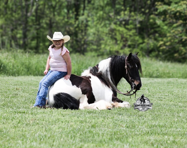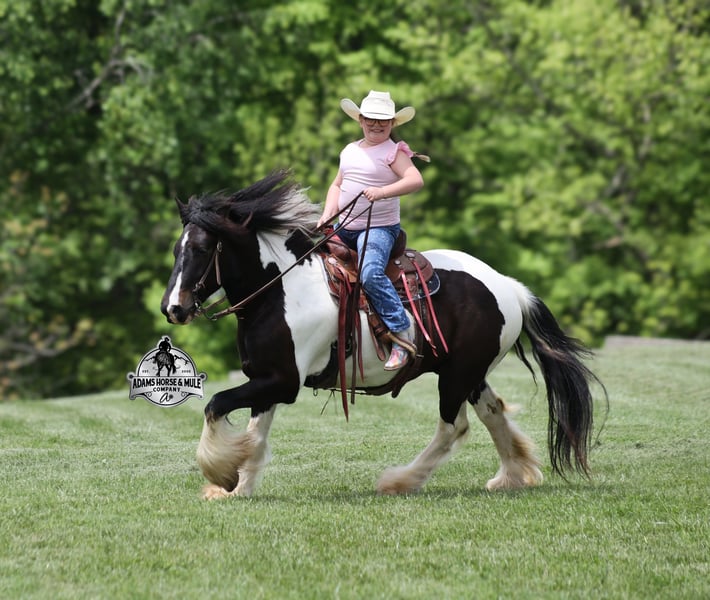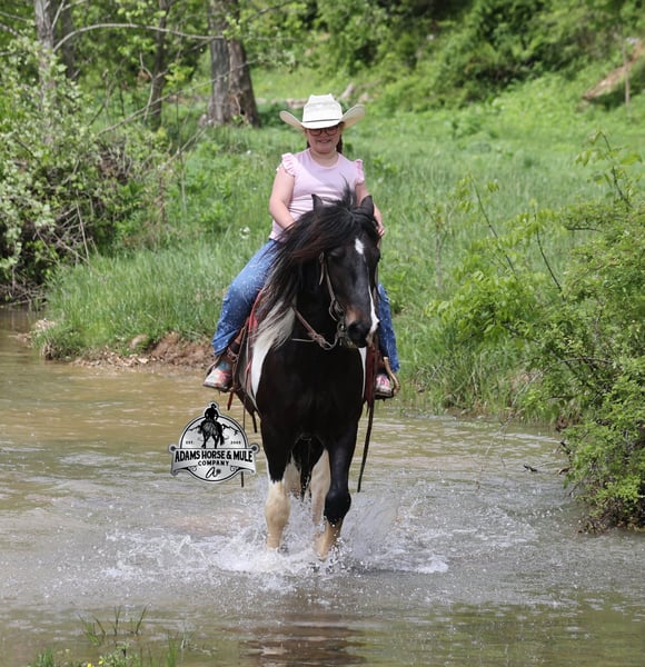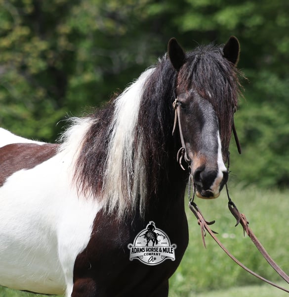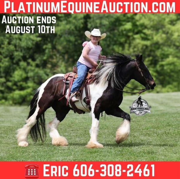 ONLINE AUCTION Place your bids at www.PlatinumEquineAuction.com Starting Bid $3500 Auction ends August 10th, 2025 Need a new saddle? Check out White Rock Saddles on our website or Facebook Meet Domino! This fancy looking Black Tobiano Gypsy Cross Gelding stands 14H and he is stocky built, he is 4 years old but its wise beyond his years! Domino has completed the natural horsemanship program and he is very friendly and loves attention!! He knows some tricks as well as he will lay down. Domino has done it all from being ridden by small children down the highways to being ridden around the ranch, pasture roped cows, rode fences and cruised the trails. Domino is confident out riding alone and does fine in groups. When out on the ranch or going down the trails he will cross creeks, ditches, logs and navigate rough, rocky areas. He is safe in traffic safe whether that be trucks or cars. He walks out easily, has a nice jog, his lope is slow and collected plus he lopes very nice circles! He has been exposed to all kinds of wildlife such as deer or turkey. He is athletic and would be a great horse to put under English tack to go over the rails with. He pastures well with others and rides the same after time off. Domino is a fun horse to ride and is sure to be everyone’s favorite! Feel free to call Eric 606-308-2461 with any questions! ONLINE AUCTION Place your bids at www.PlatinumEquineAuction.com Starting Bid $3500 Auction ends August 10th, 2025 Need a new saddle? Check out White Rock Saddles on our website or Facebook