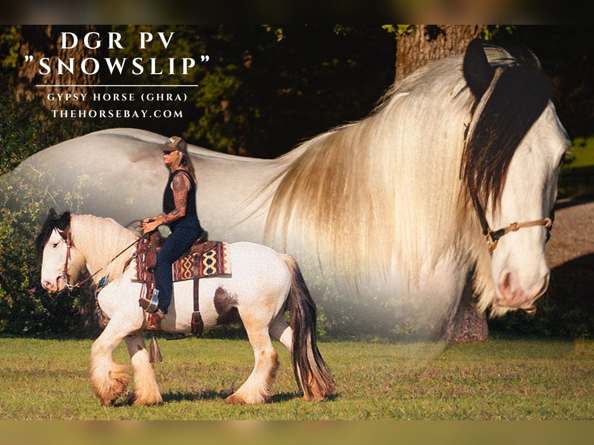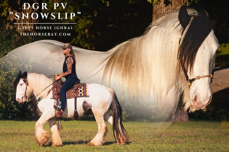 Snowslip is a coming 5-year-old, 14.2h, GHRA-Registered Gypsy Vanner gelding. (GHRA: DGR PV #AB00003642) Wearing a black magic hat and sporting a glorious double mane (full mane on both sides), this beauty is ready for the show ring. He has a traditional cob build, boasting SD lines on top and bottom, and has all the spirit and athleticism that a true cob possesses. Snowslip has been a part of our herd since the beginning of last autumn, and in that time, we’ve had the pleasure of watching him grow warm, friendly, and confident. Out at the ranch and on the trails, Snowslip is calm and brave – not fazed by new surroundings, he’ll ride around on a relaxed rein and stand quietly while you chat with your friends. He’s a happy little trail horse. In the arena, Snowslip is all business. He is forward-moving, performance-driven, incredibly responsive to leg pressure, light in the bridle, and in tune with his rider. He has a beautiful, natural collection. His trot is easy to sit, and his lope is super fun to ride – he has a big motor and is fancy broke with all the buttons. If you’re in the market for a gypsy that could excel in Western or English dressage, he is an excellent candidate. We have also started him lightly over fences, and he seemed to thoroughly enjoy it! (see his very first jump day in his full video) Snowslip is a special, talented horse that seeks trust and connection with his person. We believe he would excel with a committed and consistent riding partner. Now and then, he will have a quirky cob moment, but he has never offered anything naughty; he just gets a little nervous. He is best suited for a confident rider. Snowslip is quiet on the ground, loads and unloads with ease, stands peacefully for the farrier, and is to be clipped, bathed, and braided. He is an easy keeper, currently on a forage-only diet, and is quiet in the herd, falling near the bottom of the pecking order. He is sound, UTD, and has freshly floated teeth. PPE on file. Located in Jacksboro, TX. Text or call Courtney Maddux anytime with your questions – I’d love to tell you more about this very cool gelding. Tiny Pony Co. rider is 5’6 for reference.