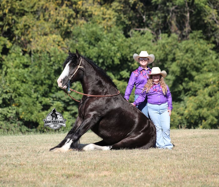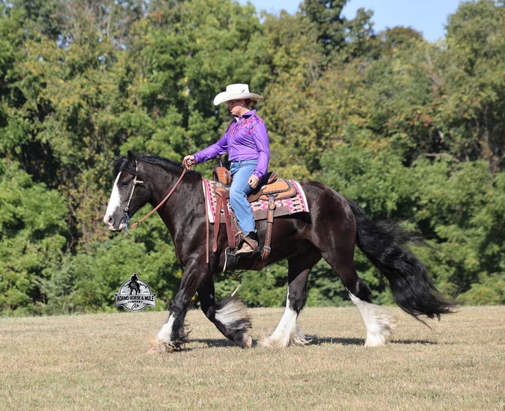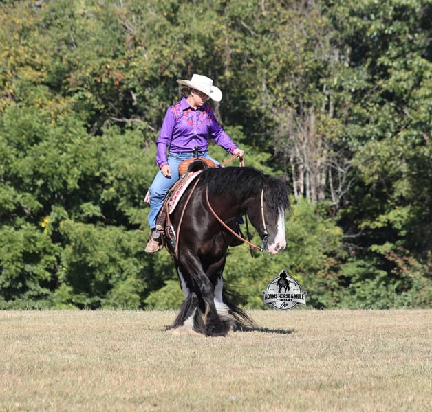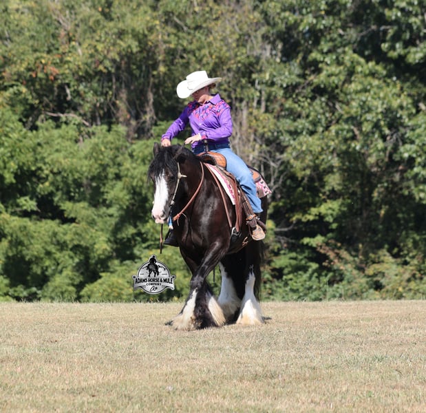 Go to visit our website for more pics and a video www.AdamsHorseAndMuleCo.com AHAMC has been in the horse business and sold horses over the internet since 2005. We have a long track record of success with hundreds of happy customers. We work hard to match riders with the correct horses and specialize in beginner safe, family friendly horses that have been used and checked out by our family! We can set up transportation anywhere in the US and look forward to working with you. Blazing Arrows is as royal and cool as any horse that you will see! He is a beautiful black registered Gypsy Vanner Gelding that stands around 15hh and he is coming 5 years old. Arrow has that eye appeal but the best part about him in deeper than the eye can see. Arrow is everyone's best friend as he loves attention and is very calm natured. Arrow has been through the natural horsemanship program and knows some tricks such as to lay down and set on him rump. He has been ridden by every member of our family all the way down to our 6 year old daughter. He has been ridden down the highways and he is traffic safe as well. Arrow is great on trails and he will cross creeks, ditches, logs and navigate rough rocky areas. He has a smooth jog, a VERY VERY nice easy to set lope and a good stop! He neckreins around and backs with ease. He has been exposed to all kinds of wildlife such as deer or turkey or other animals like cows or dogs and will go anywhere that he is asked too. He has been ridden many miles in the mountains of Eastern Kentucky and encountered every obstacle possible on the trail. He will go up or down even the steepest slopes, across deep creeks, over downed trees, and over all types of rough terrain while still being sure footed. Arrow is not cinchy, cold backed, does not crib or weave. In addition to riding, Arrow has also been drove under harness. This Arrow is sure to hit the bullseye!!! Feel free to call Eric 606-308-2461 with any questions.