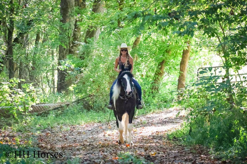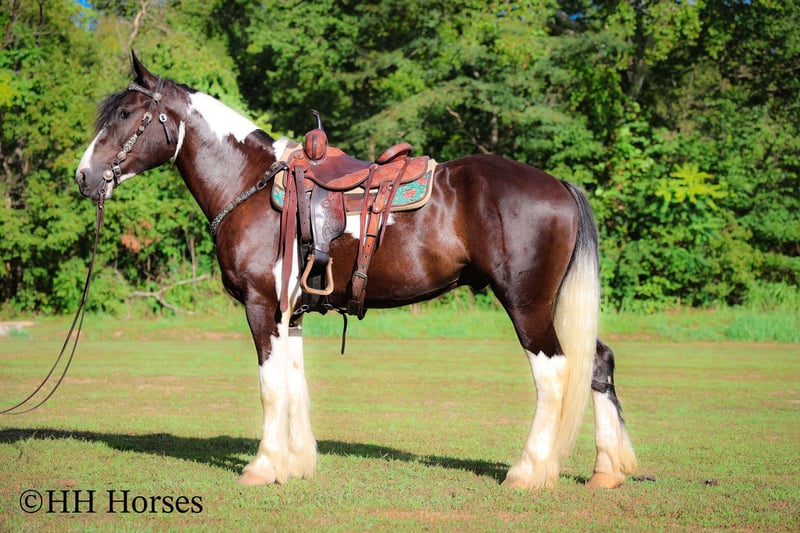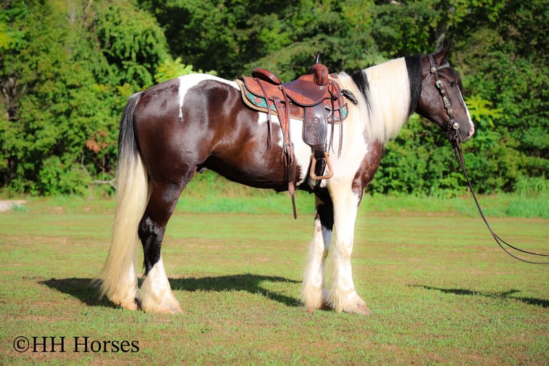 ONLINE AUCTION Place your bids at www.PlatinumEquineAuction.com Starting Bid $3500 Auction ends September 14th, 2025 Need a new saddle? Check out White Rock Saddles on our website or Facebook This is “BIG N’ RICH”, a very stout, extra flashy, super fancy moving, GYPSY VANNER SPOTTED DRAFT CROSSBRED gelding that is broke to ride and drive. He stands 16 hands tall and is 4 years old. He is broke to work double or single and has pulled hay wagons, pumpkin patch wagons, and been hooked to all farm machinery. He has pulled a cart and carriage through holiday parades. He has been in heavy traffic and lots of commotion with no issues. He is a superb trail mount that will go anywhere you point him, willingly and steadily. He is sure footed through very rocky and steep terrain and he takes his time down rough embankments and up and down the rugged trails. He is a love bug on the ground and will soak up all the attention you will give him. He lopes nice circles, catches his leads, stops easily, and backs up. He has been shown in lead line with novice riders. He has excellent ground manners, stands tied, loads, bathes, and hauls with no fuss. Located in Flemingsburg, KY. Contact Erin with HH Horses 304-238-4155 with any questions or to make a Buy It Now Offer. ONLINE AUCTION Place your bids at www.PlatinumEquineAuction.com Starting Bid $3500 Auction ends September 14th, 2025 Need a new saddle? Check out White Rock Saddles on our website or Facebook