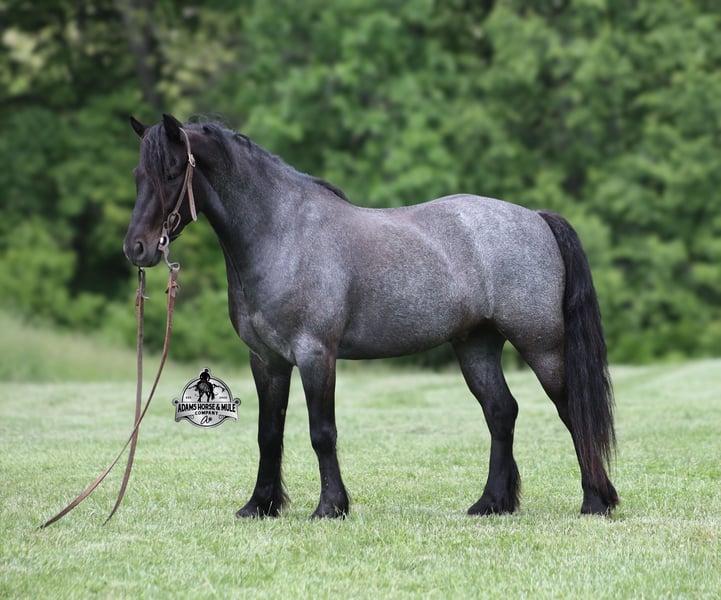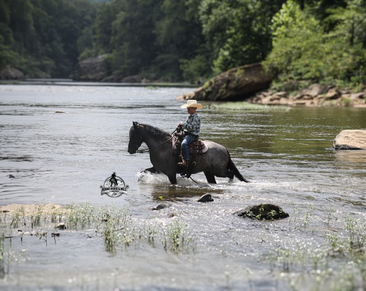 Razz is consigned to the Best Of The West Horse Sale in Gladstone, NJ on September 26-27th. You can bid online or bid in person. There is a preview day before the sale or you can come ride him prior to the sale in Mt. Vernon, KY. Razz is a 13.2h, 4 year old, Gypsy Vanner Cross, True Blue Roan Gelding and if you are looking for a horse that will bring countless smiles, miles of memories and nothing but good times in the saddle… then meet Razz. Razz has been our 7-year-old boys favorite ride all summer long, and he has been tested over and over again, passing with flying colors every time! This guy loves attention and likes to be pampered! From braids to baths, he loves his time with his kids! He is gentle enough for the kids to ride but stout enough to comfortably carry a smaller adult. Razz is a phenomenal trail horse and goes anywhere that he is asked. He has been ridden up/down steep slopes, across creeks, ditches, deadfall, rough rocky areas… you name it, and he can handle it. He rides with confidence, will go out alone, will ride in the front or back of the group and leaves the barn with no issues. Razz is traffic safe and has been ridden through town. He lopes nice circles, takes the correct leads, has a good stop and is easy to operate. In addition to riding western Razz has been ridden English and has been over jumps. He has been ridden around the ranch and through the cows. Razz is a great horse for the whole family to love and enjoy for years to come! For more info call 606-308-2461.