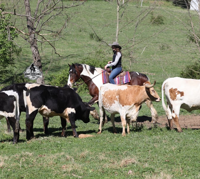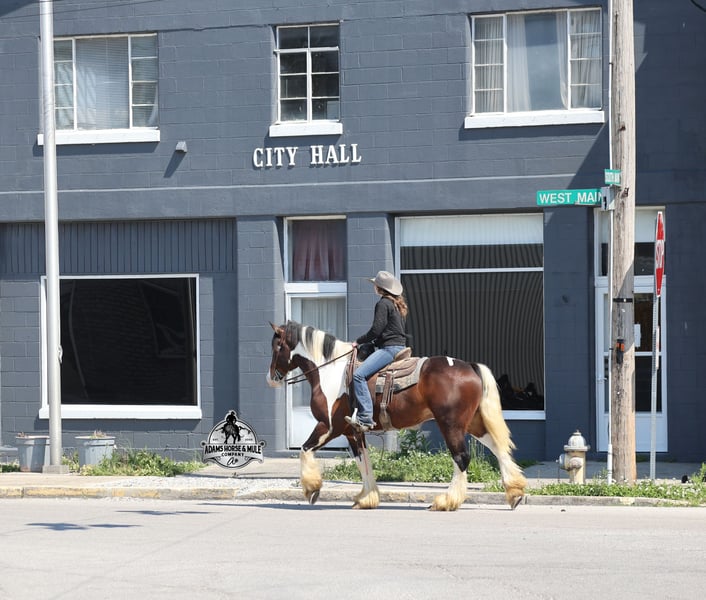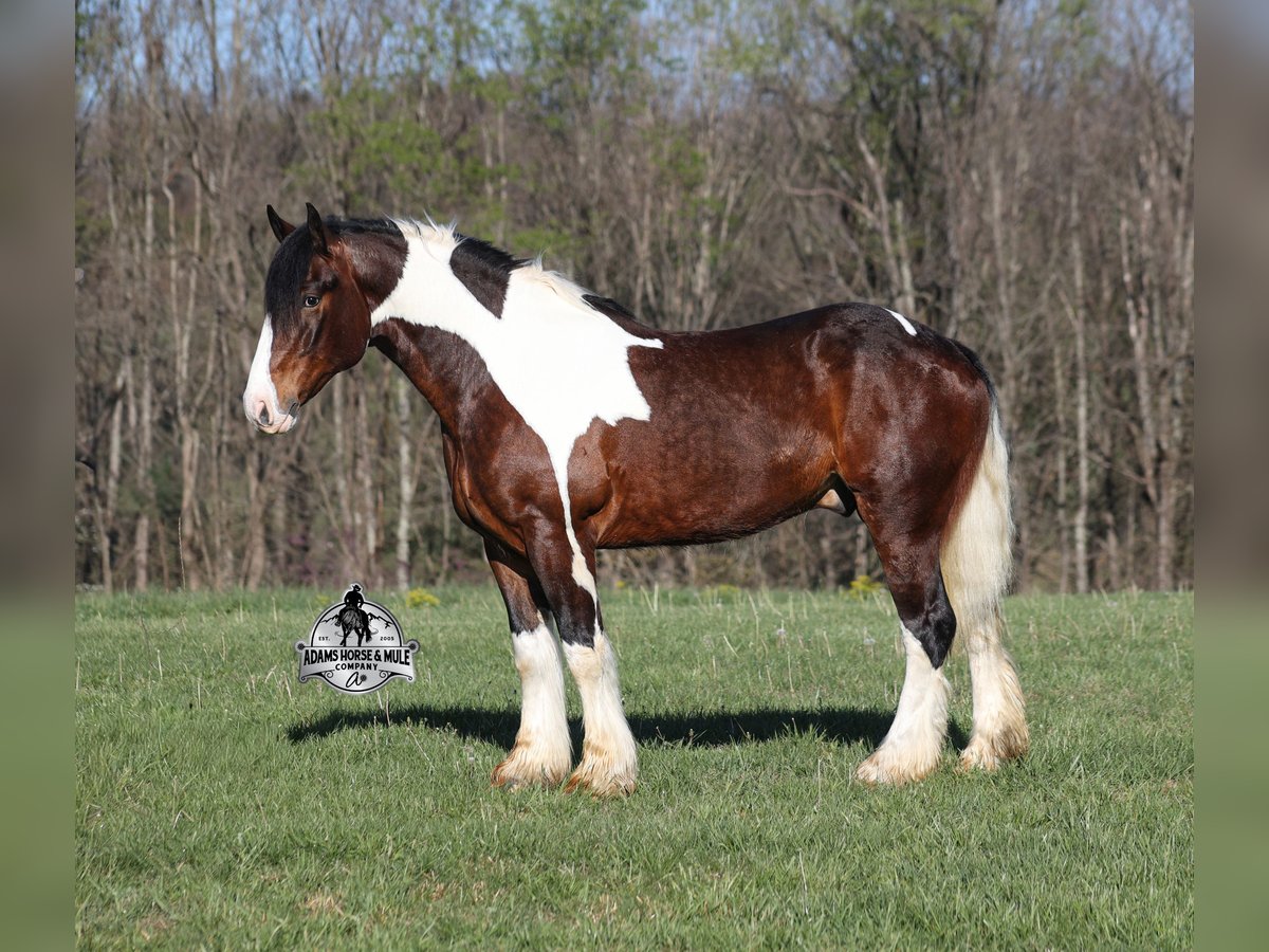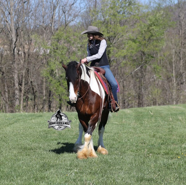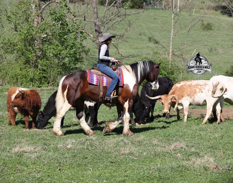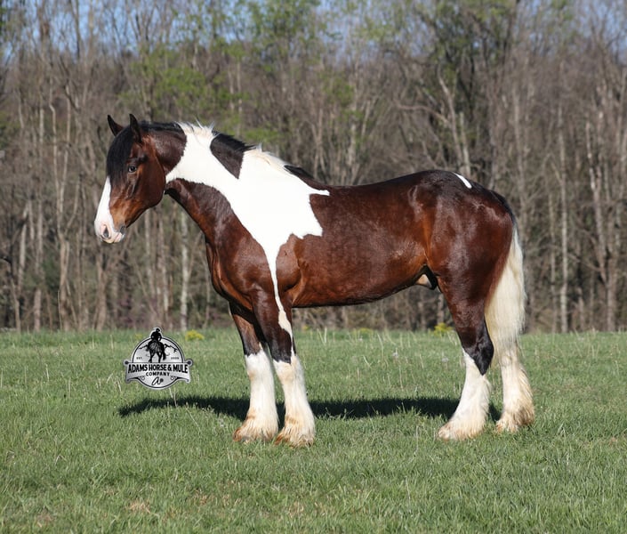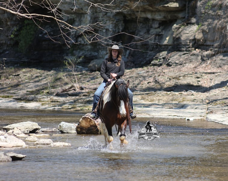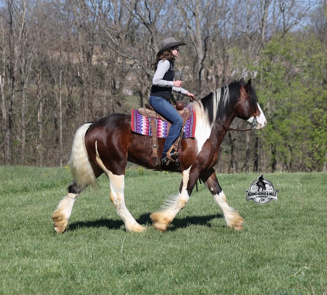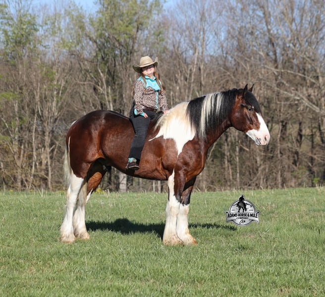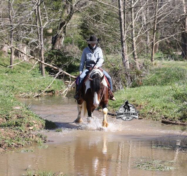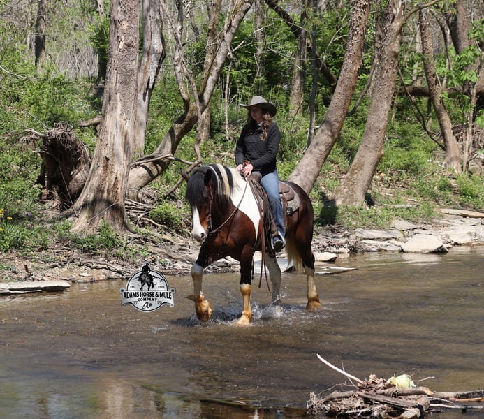 2 week Guarantee- Go to visit our website for more pics and video link at www.AdamsHorseAndMuleCo.com AHAMC has been in the horse business and sold horses over the internet since 2005. We have a long track record of success with hundreds of happy customers. We work hard to match riders with the correct horses and specialize in beginner safe, family friendly horses that have been used and checked out by our family! We can set up transportation anywhere in the US and look forward to working with you. Take a Chantz and find the love of our life! This beautiful bay tobiano gypsy draftcross that stands around 16.1hh, that will weigh around 1450lbs and he is a 6 years old is no chance at all! He is 100% the real deal in every aspect. Chantz has been through the natural horsemanship program and knows some tricks such as to lay down on command and he sets like a dog. Chantz is going to build your confidence as he will take care of all sizes and ages of riders. They don’t get too young or too old for this guy, he will take the best of care of his rider in all situations! He is well broke in the bridle, he lopes nice circles, has a smooth jog, stops on a dime and reins around really well. He has been ridden down the highways and he is traffic safe. He is broke to work under harness in all types of wagons and farm machinery, single, double or quad. Chantz is great on trails and he will cross creeks, ditches, logs and navigate rough rocky areas. He has been ridden at night on coon hunts, had guns shot off of his back and led dogs. He has been exposed to all kinds of wildlife such as deer or turkey or other animals like cows or dogs and will go anywhere that he is asked too. He has been ridden many miles in the mountains of Eastern Kentucky and encountered every obstacle possible on the trail. He will go up or down even the steepest slopes, across deep creeks, over downed trees, and over all types of rough terrain while still being sure footed. Chantz has been used to pen cattle at the stockyards, has worked on the ranch and in the branding pen. Chantz is the PERFECT addition to any family as he is just a big puppy at heart!!! Feel free to call Eric 606-308-2461 with any questions.