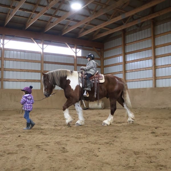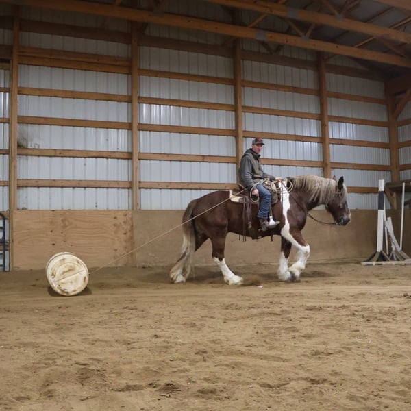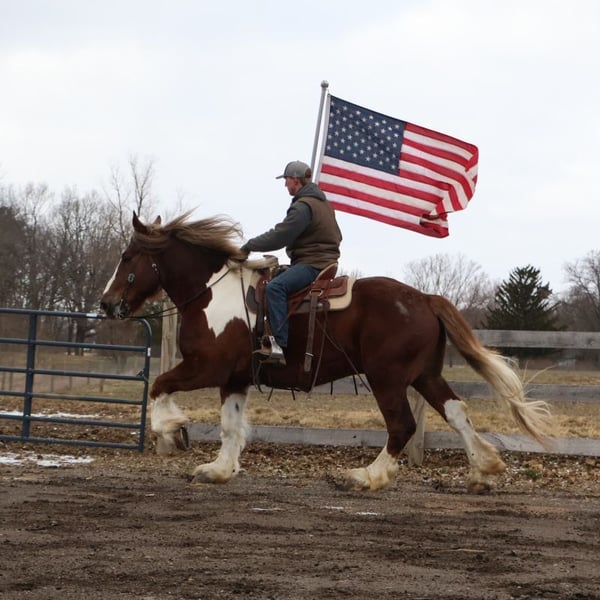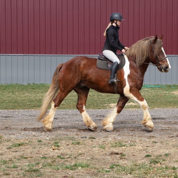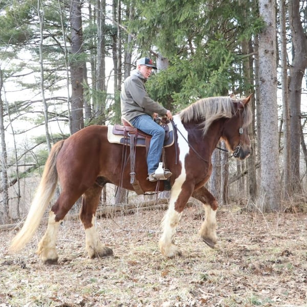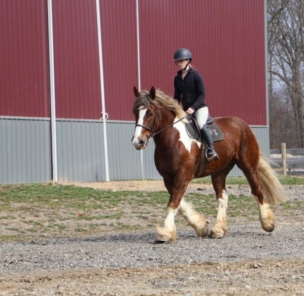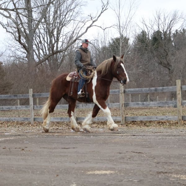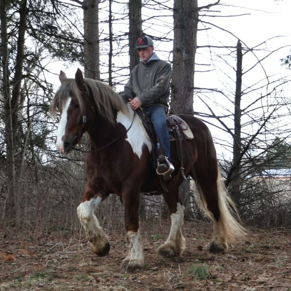 "AVAILABLE ON ONLINE HORSE AUCTION AT www DOT MagicHorseAuction DOT com BIDDING OPEN NOW thru TUESDAY | MARCH 31st! BUY IT NOW AVAILABLE! *Final price will be determined on auction site* CONSIGNOR CONTACT INFO: ELLESSEE SCHWARTZ #248-390-6831 LOCATION:Howell, MI" I'm proud to introduce Kingston. We have been holding on to this one for quite some time. He is the kind of horse that turns heads wherever he goes. This stunning boy is 7 years old, and stands a solid 16.3hh! He is a chesthnut and white in color with a silver mane and tail. Kingston is a spotted draft Gypsy Vanner cross gelding who is remarkable in every way. He has deep dapples when the sun shines on his coat. Nice feather on all 4 legs. A naturally wavey mane and tail that flow as beautifully as the ocean waves. On the ground Kingston's a perfect gentleman, he's as gentle as a lamb. Kingston is a powerhouse of strength, versatility, and athleticism. For a horse of his size, Kingston moves with incredible grace and fluidity, making him not only a reliable mount but also an athlete. You can ride him English, Western or even bareback and he will deliver an exceptional experience, seamlessly transitioning between disciplines. He knows all liberty work such as how to lay down, sit and even say yes and no. He may leave you wondering if he's a horse or a puppy dog! He is 100% a people loving horse who will greet you at the gate every day!! What truly makes Kingston stand out is his “been there, done that” attitude. He is the definition of a bombproof horse—absolutely safe in any environment. Kingston has been ridden on state roads, there’s not a truck too big to scare him! in the woods, open fields, and has even gone on a shopping trip to our local farm store! One glance into his big brown eyes will steal your heart. Out on the trails, Kingstons calm, and steady nature shines. Water crossings, tarps, bridges and other common obstacles do not phase him in the slightest. His even temperament makes him an ideal horse for beginners who need a forgiving partner, while his experience and smooth gaits make him just as enjoyable for advanced riders. We encourage you to watch the video as kids as young as 5 can handle and ride him. Kingston is the rare horse that adapts to his rider’s needs, making him a perfect fit for anyone from novice to seasoned equestrians, from small kids to savvy teens and timid adults he will take care of you! And speaking of smoothness, Kingstons three gaits are simply unbeatable. His walk, trot, and canter are incredibly fluid and comfortable, making him perfect for all-day rides without leaving you sore. Whether you are working in the arena or exploring the trails, Kingstons athleticism and stamina ensure he will keep going strong, mile after mile. In short, Kingston is the full package: strikingly beautiful, strong, athletic, and most importantly, safe. If you are looking for a versatile horse that excels in riding in a variety of disciplines from English to western, in the arena and on the trails Kingston is the perfect partner. He is ready to take on anything, whether you are a beginner looking for safety or an experienced rider seeking a smooth, dependable horse for long adventures. Kingston lives in Howell, MI 48855. Please call or text Ellesse Schwartz at 248-390-6831 for more information.