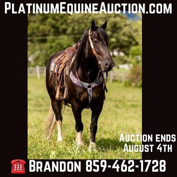 ONLINE AUCTION Place your bids at www.PlatinumEquineAuction.com Starting Bid $3500 Auction ends August 4th, 2024 Need a new saddle? Check out White Rock Saddles on our website or Facebook! DANDY’S DREAMER. Aka Amigo is a 15.2HH, 2018 Model registered Gypsy Horse (gypsy X friesian cross) gelding. Amigo is a solid and stout made horse with a lot of class and eye appeal, he’s got everything going for him, from his thick made build, to this great mind and bold colors, he’s sure to get you noticed anywhere you take him! Amigo may be pretty, but he sure has a lot more to offer than just eye appeal, Amigo classifies as a Dalmatian puppy who was VERY well socialized, he loves everyone, from the kiddos to the adults, he will be sure to try to win your heart over. Amigo may be big, but he rides sure footed and fancy moving like the small ones, he’s got a very nice flowy jog to him, and a nice big lope, with a slow going walk whether you want to hit the trails or the show ring ! Amigo is easy to catch, let me rephrase, he will catch you before you ever make it to him, he believes the best place in the pasture is right beside you ! Amigo truly believes people are his best friend, he loves being petted on and acknowledged. We’ve trail rode amigo everywhere, from big hills, to big green pastures he’s always been a solid citizen, but that’s not the best part, Amigo was originally a dude horse at the famous heart 6 ranch in Wyoming, he enjoyed toting dudes up and down the mountains and working for a living. Amigo has good solid clean legs and good feet. He will load, tie, and saddle with ease. If you’re looking for your next best friend, be sure to check amigo out, he will be sure to give you his entire heart! For more info contat Brandon Browning 859-462-1728 Located in Wallingford, KY. ONLINE AUCTION Place your bids at www.PlatinumEquineAuction.com Starting Bid $3500 Auction ends August 4th, 2024 Need a new saddle? Check out White Rock Saddles on our website or Facebook!