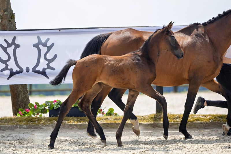 On offer is an interestingly bred half-blood foal with good prospects for eventing. The body is positively influenced by the thoroughbred with an appealing neck and good construction with regard to the later saddle position. The trot is tension-free with good mechanics. As was to be expected, the canter is this athletic foal's showpiece gait. The sire Göteborg was bred at Ratomka Stud in Belarus. Thanks to the efforts of the Bruch family, this stallion has been available to the Trakehner breed for several years and has developed into a valuable sire. He revives the extinct stallion line of the legendary Cancara. This charismatic stallion impresses onlookers with his imposing charisma - a legacy from his ancestors at the main Trakehnen stud. The foal's dam is a daughter of Sholokhov xx, who was initially at Etzean Stud, where he also produced successful obstacle horses. A few years ago he was sold to the Irish hunter breed, where he has a full stud list every year. In the falling dam line is Dashing Blade xx, a very beautifully shaped thoroughbred stallion bred in England, who has already produced some good sires for warmblood breeding. In the next generation is Solo Dancer, who despite his high GAG is no stranger to Trakehner breeding, having first worked successfully at the renowned station of Georg Hoogen on the Lower Rhine and then with the Grigoleit family in Saxony. This is truly a picture book pedigree.