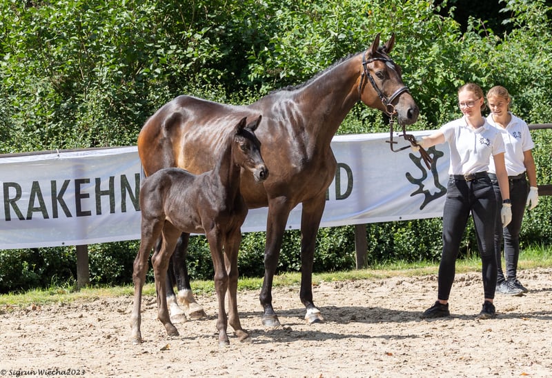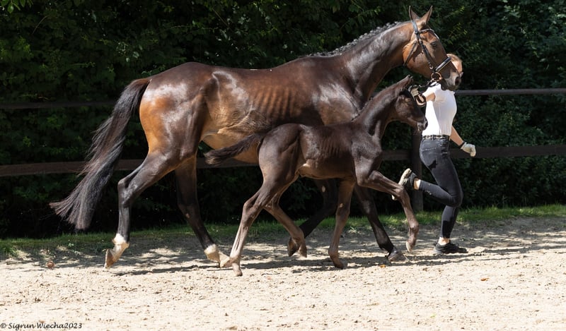 Modern colt with a lot of expression. On the occasion of his registration, this foal was admitted to the championships and was particularly appealing due to his modern riding horse appearance and flowing movements. The sire, E.H. Schwarzgold, himself successful in dressage up to advanced level, is now a guarantee for successful offspring in all areas of equestrian sport. The typey dam is from the first crop of Freiherr von Stein, who reached the final of the Bundeschampionat and is now a successful advanced level dressage stallion. The very narrow mare family of Zauberfee originates from the von Schöning family and is a guarantee for willingness to perform. The sport horses Zauberdeyk, Zauberruf, St.Pr.u.Pr.St. Zauberhexe, Zauberstab, the former Vice Bundeschampion Zauberfürst as well as the Bundeschampioness and participant in the World Championships for young dressage horses Pr.u.E.St. Zikade, all successful in the advanced (S) level, originate from this mare line. Through the granddam, St.Pr.u.Pr.St. Zaubernixe, the connection is made with the second performance line that has been cultivated by the von Schöning family for generations. E.H. Hirtentanz, who won advanced (S) level show jumping competitions, stands for willingness to perform, rideability and a human-oriented character. His dam, St.Pr.,Pr.u.E.St. Herzlani, passed one of the best performance tests of her time. Her dam, St.Pr.u.E.St. Herzchen, received numerous DLG and championship awards. An interestingly bred colt who, with the right support, has many options open to him!