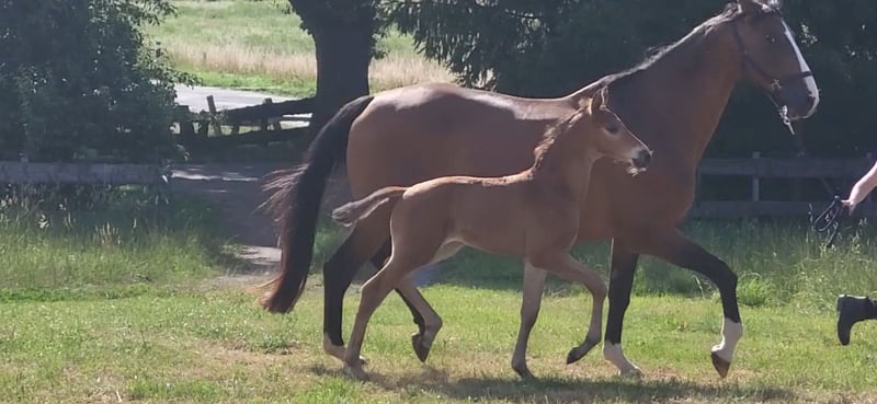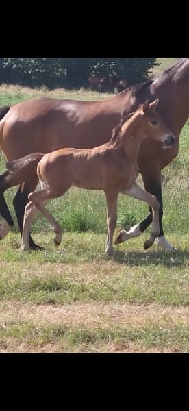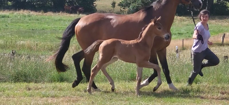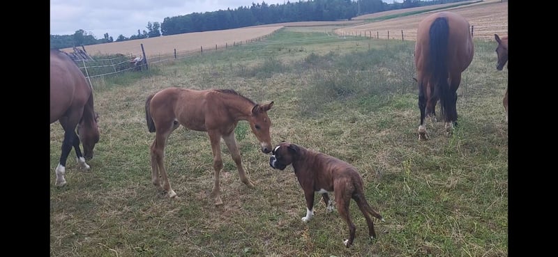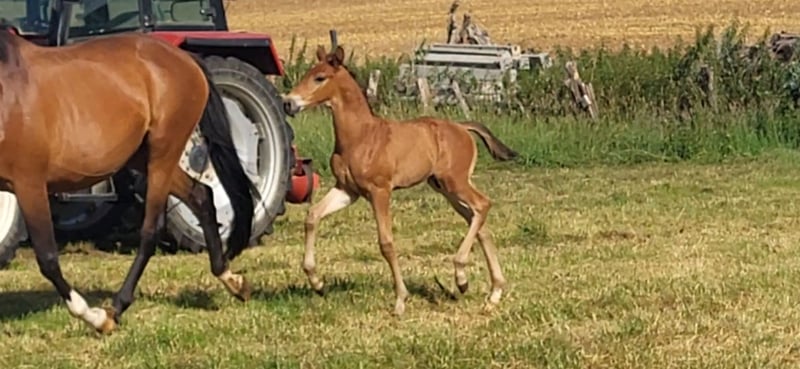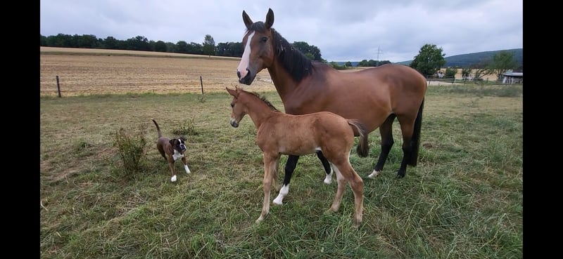 Tolles Hengstfohlen von Glücksruf (selbst international Vielseitigkeit gegangen) aus der Taira von Hirtentanz. Tryon II ist ein toll bemuskeltes, typvolles Fohlen mit 3 ordentlichen Grundgangarten. Sehr verschmust und trotzdem wach und neugierig. Die Mutter Taira ist verletzungsbedingt nur bis L Springen platziert, aber mit ihr wäre ich alles geritten. Sie hatte eine super Einstellung, tolle Manier und wollte nie einen Fehler machen. Taira ist Vollschwester zum gekörten Tarison und Taira ist ebenfalls Mutter vom besten Springhengst der Körung 2023 Tiago. Tairas 1. Fohlen Tattoo ist 5 jährig und ist altersentsprechend in der Schweiz in Dressur- Spring- und Vielseitigkeitsprüfungen platziert(ein richtiger Schleifensammler). Letztes Jahr war der Vollbruder Tryon zweitteuerstes Fohlen auf der Auktion (siehe Youtube Link). Tryon II ist ganz eng verwandt zum amerikanischen Vielseitigkeitspferd Tsetserleg und zu den gekörten Hengsten Tecumseh Tempelhof und Tschaikowsky. Ein 2 jähriger Vollbruder kann auch noch bei mir besichtigt werden
