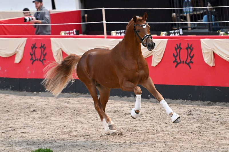Camar Bahrain, een van de favorieten van de 61e Trakehner Hengstenmarkt. Hij werd goedgekeurd en geëerd met de prijs van de Landbouwkamer voor de beste in Sleeswijk-Holstein gefokte hengst. Naast zijn mooie type werd hij geprezen om zijn goede basisgangen en zijn vriendelijke, eerlijke karakter. Zijn vader was de gevierde licentiewinnaar van de VZAP in Luhmühlen en onder andere klassewinnaar en nationaal reservekampioen in Aken in 2019. Hij bracht al een dochter in het GP-programma van het Trakehner Verband met PrSt Camar Qinea ox en een HLP-winnaar met Camar Qbinec ox. Hij is een van de Arabische topverervers in Duitsland. Bahrain's moeder Barani is een topmerrie van het Verband uit de beste dressuurstammen met goede SLP en plaatsingen in RPf en DPf A. Ze heeft al een veilingveulen gebracht met Boulevard van Gabon. Camar Bahrain zal zijn eerste dekseizoen doorbrengen op het Geling hengstenstation in Gowens. Vragen over de fokkerij en bestellingen kunt u rechtstreeks naar Mr Geling sturen - www.hengststation-geling.de foto's: Knaack-Lindemann/Dr.Richterich