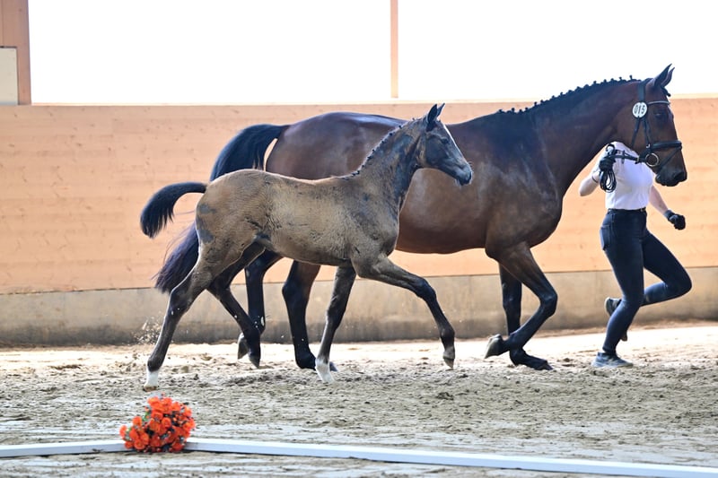 Höchste Zuchtqualität und ganz große Perspektiven für den Sport bietet dieses Spitzenfohlen gleichermaßen. Typ, Ausstrahlung und vornehmes Auftreten, machen diese großrahmige Tochter des Blancor zu etwas ganz Besonderem. Der Körper ist korrekt mit großzügigen Partien. Sie ist langbeinig und besitzt ein korrektes Fundament. Der Trab ist schwungvoll und geschmeidig mit moderner Mechanik, die große bergauf gesprungene Galoppade lässt keine Wünsche offen. Der Schritt ist gelassen mit dem gewünschten Raumgriff. Wer ein Spitzenfohlen im modernsten Zuschnitt sucht, sollte hier nicht lange überlegen. Der Vater Blancor war Trakehner Geländechampion 2022 und hat schon auf der Körung für Aufsehen gesorgt. Den 100 TT legte er als Zweitplazierter ab. Sein Vater Adorator ist ebenfalls im Vielseitigkeitssport erfolgreich. Mütterlicherseits stammt Blancor aus einer der leistungsstärksten Stutenfamilien. Seine Mutter Blanchette ist Vollschwester zu 3 gekörten Hengsten, darüber hinaus konnten drei Ihrer Töchter als Eintragungssiegerinnen punkten. Ihr Sohn Basmati war für die Weltreiterspiele in Tryon nominiert. Seine Schwester Bisazza hat Erfolge bis CCI** und Ballouette war in Springprüfungen der Klasse S erfolgreich. Aus dieser Leistungsfamilie stammen weiterhin die S – Springpferde Brenner und Braveur und der ehemalige Vize-Bundeschampion Brancusi, der aktuell unter Beatrice Hoffrogge international Grand Prix plaziert ist. Auch die mütterliche Abstammung ist erlesen. Die Mutter Anais trägt den Staatsprämien- und den Prämientitel. Sie ist leistungsgeprüft und hat in 8 Zuchtjahren 8 Fohlen gebracht. 2 ihrer Töchter sind ebenfalls prämiert. Der Muttervater Kentucky war Körungssieger und hat sich als Vater rittiger und ganggewaltiger Sportpferde etabliert. Er residiert heute als Hauptbeschäler in Mexiko. Der Muttervater Ballzauber ist ebenfalls ein hochveranlagtes Sportpferd der nach sportlichem Einsatz in Amerika heute wieder in Deutschland stationiert ist. Stammutter ist die Hyperiontochter Alwina, die im Dezember 1945 in Neublesern Krs. Thorgau geboren ist und 1953 von Dr. Uppenborn in Hessen entdeckt wurde.