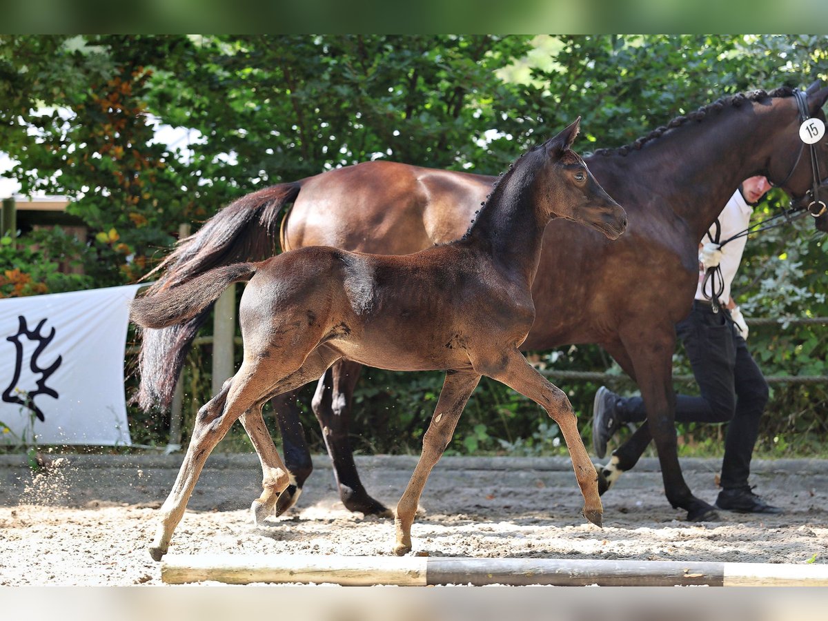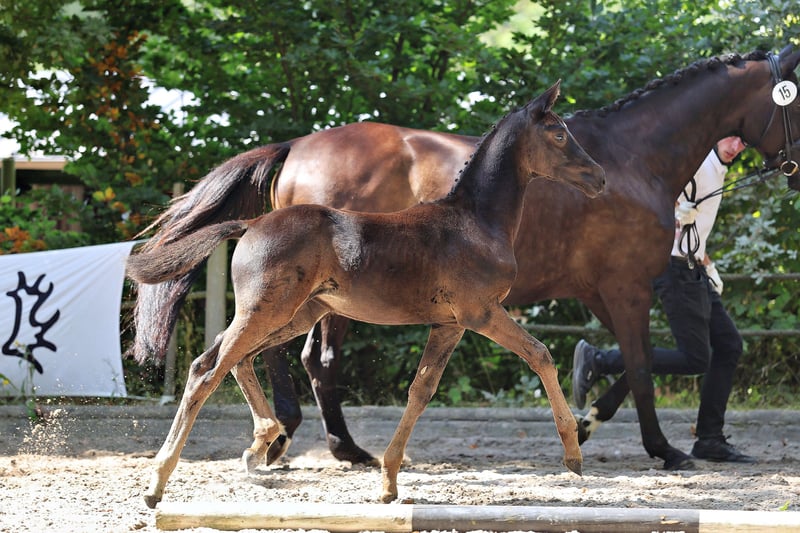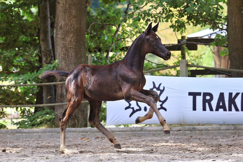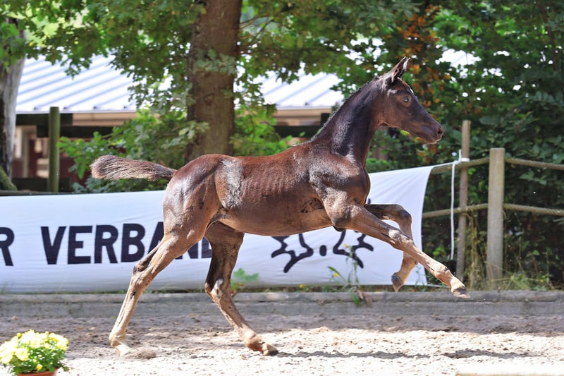Unsere Goldfee v. Hallifax a.d. St.Pr. Stute Golden Surprise v. Karolinger-Hertug ist an Adel und Schönheit nicht zu überbieten! Schweren Herzens suchen wir einen Bestplatz für dieses kleine züchterische Juwel. Der Stall ist voll und auch wir können nicht alle behalten… Goldfee rangierte auf dem Endring des Trakehner Fohlenchampionats West 2025 und wurde mit 55,5 Punkten als Championatsfohlen prämiert. Die Zaubermaus präsentierte sich stolz und edel und bekam für den Typ eine 8,5. Auch die Gangqualität wurde mit 8,0 im Trab und Galopp bewertet. Außerdem zeigte das Fohlen während der Präsentation ihr hervorragendes Interieur. Völlig gelassen und wohlerzogen absolvierte sie jeden Auftritt im Freilaufen und geführt am Halfter. Sie ist sehr menschenzugewandt, genau wie die Mutterstute, steht in einer kleinen Herde auf der Weide mit Offenstall/Laufstallhaltung in der Nacht. Meine Kinder können mit Stute sowie Fohlen am Halfter spazieren gehen bzw. die Stute mit Fohlen bei Fuß reiten. Das ABC der Fohlenschule mit Hufe geben, Putzen, Schmied vorstellen, Hänger fahren, Wurmkur verabreichen – ist alles von klein auf geübt und problemlos möglich. Die Mutter, St.Pr.St. Golden Surprise v. Karolinger I-Hertug ist ein Bild von einer Trakehner Stute und einfach wie gemalt. Sie ist im aktuellen Trakehner GP Programm und hat die Staatsprämie. Sie war, wie ihr Vater und fast alle Großväter bis zur Dressur Klasse S siegreich mit über 120 Platzierungen in den Niederlanden! Dabei war die jetzige Bilderbuch-Mutterstute ein leichtrittiger Schleifengarant und später meiner Tochter mit 10 Jahren ein einmaliges Lehrpferd. Ihre Stutenleistungsprüfung absolvierte sie damals mit 7.86 als eine der Besten des Jahrgangs und errang Dreijährig den Ib-Preis auf der Eliteschau in Wickrath, im Folgejahr den Ib-Preis ihrer Klasse anlässlich der Landesschau Rheinland und im Jahre 2019 schließlich den Klassensieg der Landesschau in Wickrath. Sie kommt aus der Stutenfamilie der O177A Gundel - Schlemminger-Grabau und führt in der hinteren Generation neben Erfolgsgarant E.H. Gribaldi die Verbindung von Mackensen, Saros xx und Magneet. Aus der gleichen Linie hat Züchter Antoon von Osch schon fünf Elitestuten. Auch Golden Surprise ist auf gutem Weg dorthin. Ihre bildschöne Tochter Goldmarie aus dem Jahr 2024 ist typvoll und mit den guten Reitpferdepoints der Vorfahren ausgestattet. Für den Typ bekam das Prämienfohlen (55 Punkte) dann auch gleich eine 8,5 auf dem Fohlenchampionat West. Vater von Goldfee ist der bewegungsstarke und lackschwarze Prämienhengst Hallifax Lyng v. Schwarzgold a.d. Halle Berry v. Aston Martin, der 2022 das Trakehner Bundeschampionat der Vierjährigen in Dänemark und 2023 und 2024 das Trakehner Bundeschampionat der Fünfjährigen in Münster-Handorf gewann. Vater von Hallifax Lyng ist Schwarzgold, dem in zweiter Generation der legendäre Imperio folgt, der unter Reitmeister Hubertus Schmidt im internationalen Grand Sport siegreich war. Schwarzgold selbst war Bundeschampion und ist einer der wenigen Hengste, die sich drei-, vier-, fünf- und sechsjährig für das Bundeschampionat qualifizieren konnten und später bis S erfolgreich waren. In der Zucht hat er sich mit Siegerstuten, über 10 gekörten Hengsten, darunter ein Sieger- und ein Reservesiegerhengst, einen Namen gemacht. Die Mutter Halle Berry war dreijährig Trakehner Championesse in Neumünster. Sie erhielt im Schritt, Trab und Galopp jeweils die Note 9 und erreichte damit das höchste Ergebnis auf nationaler Ebene! Im selben Jahr war sie der Star der Auktion in Neumünster, wo sie für 65.000 Euro als teuerstes Reitpferd verkauft wurde! Großvater Aston Martin startete unter Helene Melsen in internationalen Großen Preisen. Aston Martin war jahrelang Mitglied der dänischen Nationalmannschaft und hat viele Siege und Platzierungen auf nationaler und internationaler Ebene errungen. Hallifax entstammt einer der derzeit besten Zuchtlinien des Trakehner Verbandes, der H-Linie. Aus demselben Stutenstamm stammt auch Stempelhengst Helium. Mehr zum Fohlen auf unserem Instagram Kanal Rittergut_Schafhausen Kontaktaufnahme gerne telefonisch oder per WhatsApp. Oder per E-Mail an postamt@gut-schafhausen.de