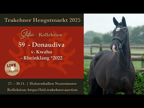 In besonders vornehmer Aufmachung erscheint die charismatische Donaudiva. Sie bewegt sich federleicht, taktbeflissen und dynamisch und vermittelt eine vortreffliche Referenz ihrer unter Dressuraspekten exklusiven Genetik, denn in den ersten drei Generationen verbinden sich sechs in Grand Prix- und S-Dressurkonkurrenzen erfolgreiche Vererber. Die Mutter ist eine rechte Schwester der ZSE-Reservesiegerin Donauflamme, zweifache Trakehner Reitpferdechampionesse, Finalistin im Bundeschampionat und Preisspitze der Reitpferdeauktion des Trakehner Hengstmarkts. (NMS ‘12/49) Eng verwandt mit dem vielfachen S-Dressursieger Donaudichter. Die Stute wird anlässlich des Trakehner Hengstmarktes am 28.112025 bei einer Auktion versteigert, alle Informationen finden Sie unter: https://bid.trakehner.auction/auctions