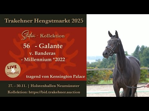 Die aktuelle Siegerstute der Zentralen Stuteneintragung Rheinland-Pfalz/Saar ist eine Edeldame mit Stil und Klasse und eifert auch in der bewundernswerten Dynamik ihrer Bewegungen der noblen Mutter als ZSE-Siegerstute Niedersachsen Nord-West nach. Auf Vaters und Mutters Seite finden die beiden tragenden Stämme des unvergessenen Hochzüchters Horst Ebert zusammen. Galante knüpft enge verwandtschaftliche Bande mit der als Auktionsspitze gefeierten Jahressiegerstute Grace Kelly (NMS‘22/51), dem Prämienhengst, Dressurpferdechampion und S-Dressursieger Giuliani (Konrad Müller), sowie dem gekörten S-Dressursieger Ganderas (Heinrich Brähler). Die Stute wird anlässlich des Trakehner Hengstmarktes am 28.112025 bei einer Auktion versteigert, alle Informationen finden Sie unter: https://bid.trakehner.auction/auctions