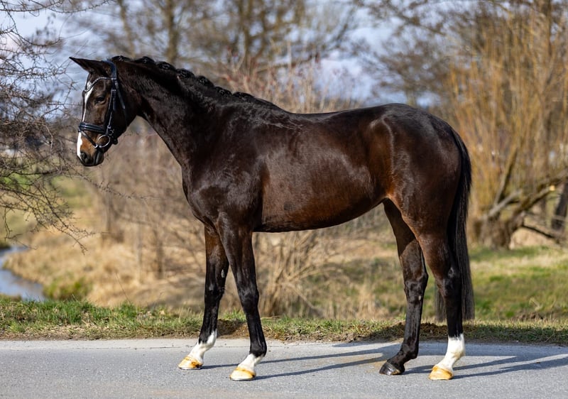 Dark brown 5-year-old Trakehner mare – refined and well-ridden For sale is an elegant, long-legged 5-year-old Trakehner mare in noble dark brown, with plenty of type and presence. She is registered in the Main Studbook and completed her mare performance test with an overall score of 8.0 – making her an interesting option both sportingly and for breeding purposes. Under saddle, she proves to be reliable, well-ridden, and pleasant in contact. She is sensitive to aids, provides good riding feel, and works with motivation. Her clear attitude and willingness to perform make her a versatile partner – suitable for ambitious leisure riders as well as riders with sporting goals. In daily handling, she is friendly, balanced, and uncomplicated. A pretty, modern all-rounder with potential and quality. ⸻ IMPORTANT: The mare is currently barefoot. With front shoes, she could possibly present herself even more expressively from the front. She has very good hooves and manages barefoot excellently. ⸻ 📍 Location: Rosenheim 📞 Contact gladly by phone or WhatsApp 📧 Also reachable via email ❗ Please do not send inquiries via Messenger
