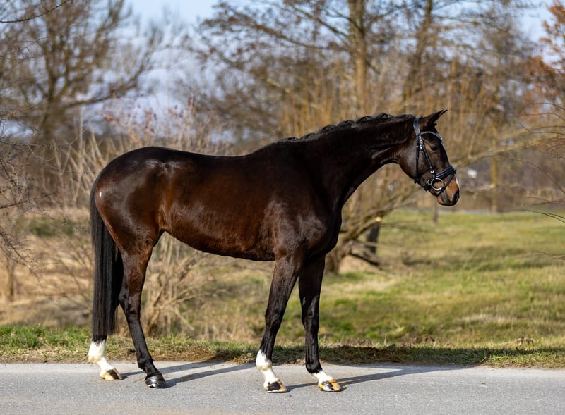 Dark brown 5-year-old Trakehner mare – refined and well-ridden For sale is an elegant, long-legged 5-year-old Trakehner mare in noble dark brown, with plenty of type and presence. She is registered in the Main Studbook and completed her mare performance test with an overall score of 8.0 – making her an interesting option both sportingly and for breeding purposes. Under saddle, she proves to be reliable, well-ridden, and pleasant in contact. She is sensitive to aids, provides good riding feel, and works with motivation. Her clear attitude and willingness to perform make her a versatile partner – suitable for ambitious leisure riders as well as riders with sporting goals. In daily handling, she is friendly, balanced, and uncomplicated. A pretty, modern all-rounder with potential and quality. ⸻ IMPORTANT: The mare is currently barefoot. With front shoes, she could possibly present herself even more expressively from the front. She has very good hooves and manages barefoot excellently. ⸻ 📍 Location: Rosenheim 📞 Contact gladly by phone or WhatsApp 📧 Also reachable via email ❗ Please do not send inquiries via Messenger
