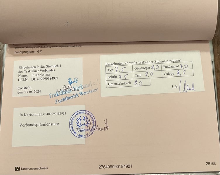 Jument Trakehner de 5 ans, brun foncé – fine & souple À vendre, une élégante jument Trakehner de 5 ans, élancée, d’un joli brun foncé, avec beaucoup de typicité et de présence. Elle est inscrite au stud-book I et a passé sa performance de jument avec une note finale de 8,0 – ce qui en fait une option intéressante tant sur le plan sportif que sur le plan de la reproduction. Sous la selle, elle se montre fiable, souple et agréable en reprise. Elle est sensible aux aides, transmet un bon ressenti à l’équitation et travaille avec motivation. Sa détermination claire et sa volonté de performer en font une partenaire polyvalente – aussi bien pour des cavaliers de loisir ambitieux que pour ceux ayant des objectifs sportifs. Au quotidien, elle se montre amicale, équilibrée et facile à vivre. Un joli modèle moderne, polyvalent, avec du potentiel et de la qualité. ⸻ IMPORTANT : La jument est actuellement non ferrée. Avec des fers à l’avant, elle pourrait probablement se montrer encore plus expressive sur la piste. Elle possède de très bons pieds et se débrouille parfaitement pieds nus. ⸻ 📍 Localisation : Rosenheim 📞 Contact possible par téléphone ou WhatsApp 📧 Également joignable par e-mail ❗ Merci de ne pas envoyer de demandes via le messager