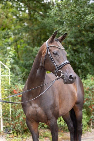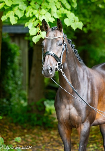 This striking daughter of the sire Interconti is a true eye-catcher that one cannot resist. She stands in a high-class, modern mare type and has been registered with 55 points during her Central Mare Registration, making her a premium candidate of the Trakehner Association. In addition to her unmistakable presence, this mare impresses with good, powerful basic gaits. Furthermore, the pedigree possesses a special athletic as well as breeding attractiveness. The mother of "Insa," who is a half-sister to the licensed stallion Iffland (by Tenor), produced among others the licensed later Vice Champion in eventing and now proven in international 4-star competitions, Ibsen (by Checkpoint). A special breeding offer that is for sale due to age-related cessation of breeding.