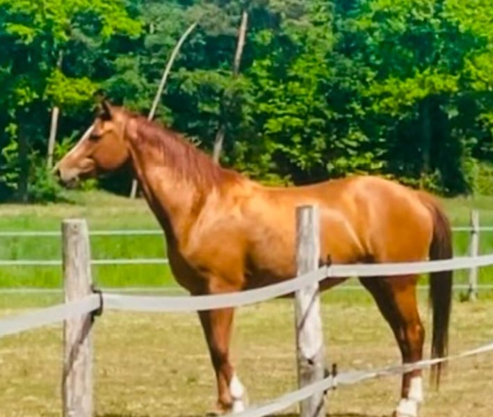 Elegant Trakehner mare for sale – ideal for breeding and/or leisure riding Up for sale is a beautiful Trakehner mare, born in 2017. With her stunning metallic gold coat and a height of 164 cm, she is a true eye-catcher both visually and in terms of size. She comes from a solid bloodline, not mainstream, and offers excellent prerequisites for breeding as well as for the ambitious recreational or competitive rider. The mare has a strong character, is friendly in handling, and demonstrates a good basic training. She is healthy, regularly vaccinated, and free from known health issues. Due to her pedigree and temperament, she is well-suited for breeding purposes, but also for versatile equestrian disciplines. If you are interested or have further questions, please feel free to contact me. A viewing can be arranged by appointment.