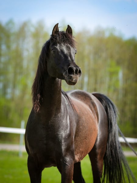 Hello, I am selling a beautiful black mare. She has a lovely movement, is well-behaved, and works nicely in hand.