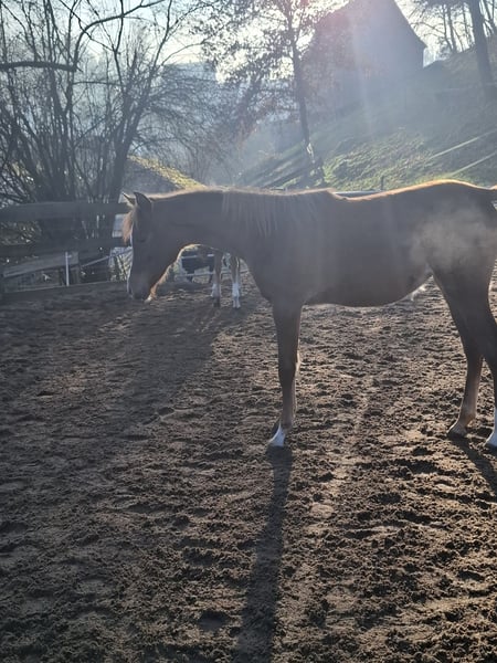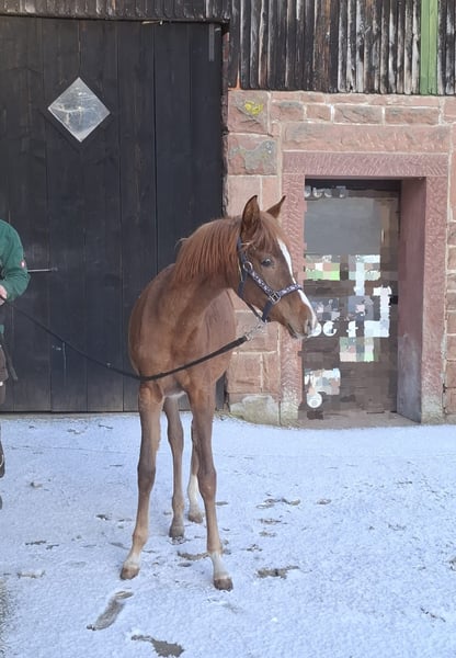 For sale is our adorable purebred Arabian mare, Rosa el Portofino. Born: February 18, 2025 Color: Chestnut Estimated final height: approximately 15.5 hh CA free Rosa is microchipped and has a passport. She is familiar with basic foal handling and is also calmly led by our daughter. She is regularly dewormed and introduced to the farrier. Currently, she spends nights in a box and during the day in a herd in an open stable. We do not send videos; a personal meeting is highly encouraged. We look forward to friendly inquiries, please contact us by phone only at 0170/2066751.