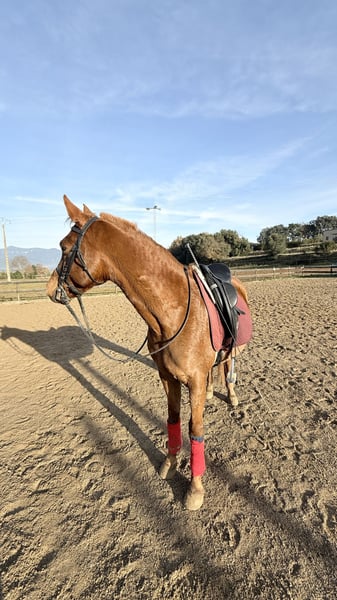 10-year-old chestnut gelding pony with an exceptional and noble temperament. He has excellent aptitudes for jumping, leisure riding, lessons, and trail riding. Capable of navigating small courses and suitable for riders of all levels. He also has experience in schooling sessions for training, as well as guided trail rides or group lessons.