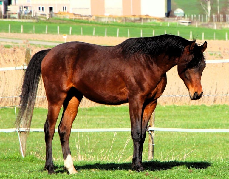 Nicht nur optisch ist Pabro zuckersüß, er hat auch einen eben solchen Charakter! Er ist äußerst anhänglich und neugierig, lässt sich liebend gern putzen und kraulen sowieso. Gerne kommt er mit, auch alleine, um Neues zu entdecken. Er vertraut dem Menschen und lernt schnell. Man kann mit ihm bereits alleine Spazieren gehen, er ist feinfühlig, reißt nicht am Strick, geht über Bodengitter, kennt bellende Hunde, den dörflichen Straßenverkehr und so wird er später auch mal problemlos alleine ins Gelände ausreiten. Pabro ist noch nicht eingeritten, aber alles andere kennt er bereits und so ist er wirklich gut zu haben und macht Freude. Außerdem ist er recht cool, sein bester Freund ist ein gleichaltriger Anglo welcher aber deutlich größer ist. In unsicheren Situationen, lässt der Anglo dann seinen kleinen Freund Pabro vor und dieser geht dann auch mutig vorne weg. Pabro ist artgerecht in einer großen Herde aufgewachsen und somit bestens sozialisiert und robust. Pabro steht im Elsaß in 67440 Reutenbourg.