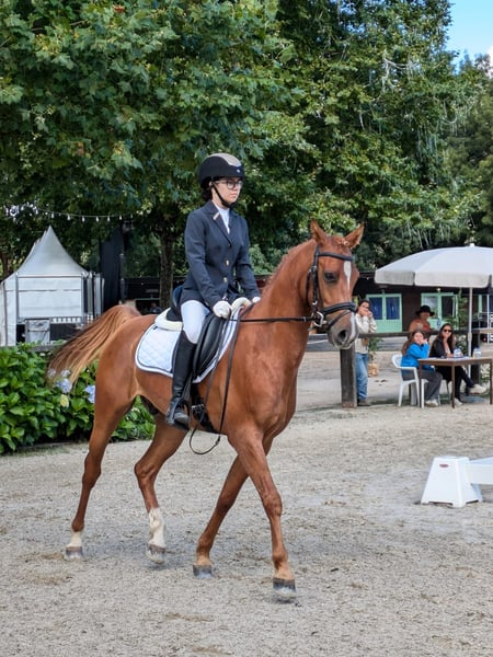 5-jähriger Hengst, fuchsfarben, ca. 150 cm Stockmaß. Sehr gut ausgebildeter Dressurhengst mit schönen Bewegungen und ausgezeichnetem Gleichgewicht in allen drei Grundgangarten. Er zeigt bereits schöne Passagen und beginnt mühelos und leichtfüßig mit dem Piaffe. Energetisch, aber respektvoll, menschenbezogen – ideal für einen Reiter, der ein sensibles und vielversprechendes Pferd sucht. In perfektem Gesundheitszustand, regelmäßig gearbeitet, Papiere vorhanden, hochwertige Abstammung.