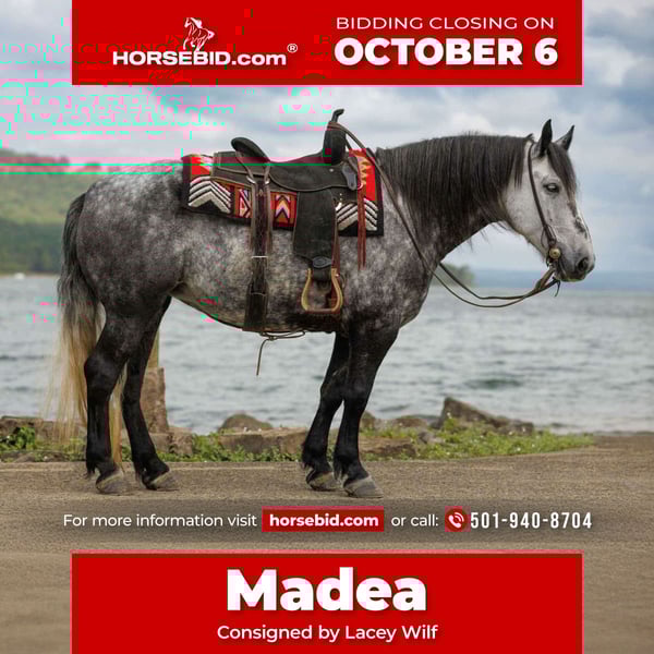 🍂 𝓐𝓾𝓽𝓾𝓶𝓷 𝑨𝑳𝑳 𝑺𝑻𝑨𝑹 𝑳𝑰𝑵𝑬𝑼𝑷 🍂 Happening now thru MONDAY | OCTOBER 6th - Available EXCLUSIVELY on HorseBid's website! For more details and to register visit: www.Horsebid.com CONSIGNOR CONTACT: Lacey Wilf 501-940-8704 LOCATION: Quitman, AR BREED: American Draft Pony REGISTERED: Yes REGISTERED NAME: Outback Acres Queen COLOR: Dapple Grey HEIGHT: 14.1 AGE: 9 GENDER: Mare Madea is a 2016 model registered draft pony whose elegance is matched only by her versatility. Standing at 14.1 hands, she is the perfect height—substantial enough to carry the biggest adults with ease, yet accessible enough for younger riders, making her a true fit for all sizes. With her striking silver-dapple coat, strong bone, and graceful carriage, she is the very picture of refinement—substantial enough to impress, yet soft and feminine in her expression. She carries herself with poise in every setting, whether stepping into an arena, gliding down the trail, or moving gracefully in harness. She is as versatile as she is beautiful, riding both English and Western with ease and driving with the polished precision of a true lady. In harness, she is nothing short of exquisite—responsive, stylish, and steady, whether pulling a carriage through town, a buggy down country lanes, or working in a more formal setting. Her driving experience is extensive, and she moves with a fluid rhythm that makes her both a pleasure to watch and a joy to handle. Always soft in the lines and confident in her step, Madea exemplifies grace and dependability as a driving pony. Nothing seems to ruffle her composure—she remains unbothered by tarps, flags, fireworks, heavy traffic, or even the hum of a drone. The fast-paced hustle of the cow sale doesn’t disturb her, further proving her unshakable mind and steady presence. On the trail, Madea’s elegance shines through in her balance and confidence. She takes water, bridges, logs, and brush with the same calm assurance as she does the open road. Every ride with her feels effortless, enjoyable, and distinguished, making her a partner who elevates even the simplest outing into something memorable. Yet it is her personality that truly sets her apart. Madea adores attention and soaks up every moment of admiration, greeting people with kindness and warmth. She is gracious on the ground—easy to catch, gentle with her feet, and perfectly mannered to saddle, bridle, wash, and haul. Her natural class and calm demeanor make her a favorite in any barn, and her presence is one that cannot be overlooked. Elegant, gentle, and endlessly capable—Madea is not just a pony, but a statement piece: one who embodies grace, substance, and timeless beauty while being safe and dependable in every way.