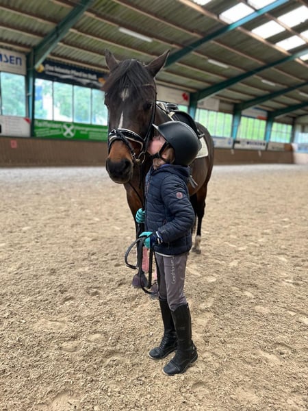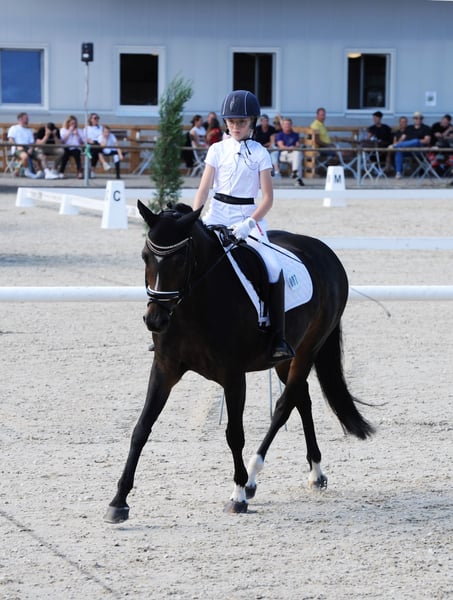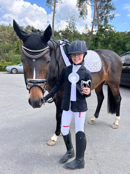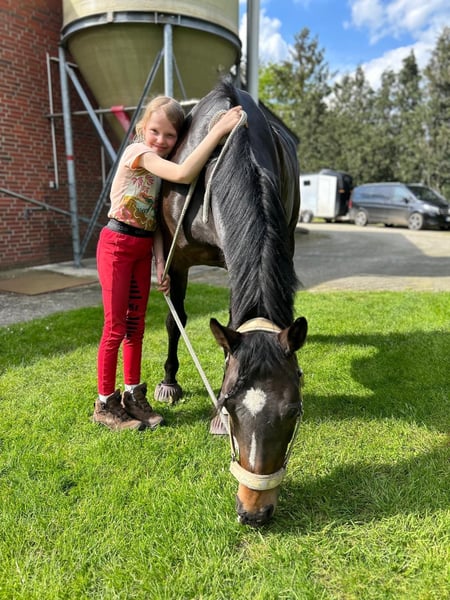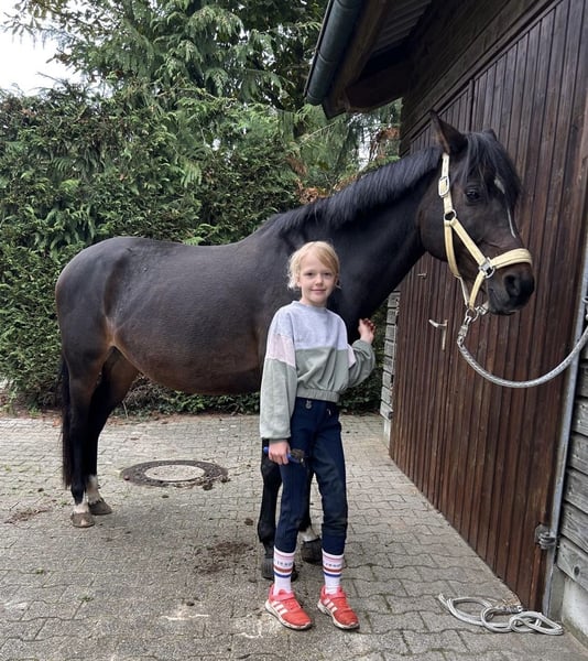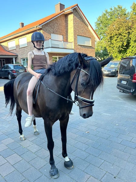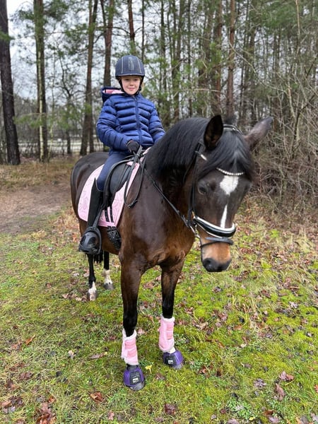 Sehr brave, erfahrene und zuverlässige 15-jährige dunkelbraune Ponystute, Größe 1,48 m. Rainbow Angel ist sehr gut ausgebildet und startete auf Turnieren in der Dressur bis M*. Auch am Sprung zeigt sie sich talentiert - wurde auf Turnieren aber nur in der Dressur vorgestellt. Sie hat sehr gute Bewegungen, kennt auch Wechsel und ist problemlos im Umgang, so dass Kinder gut mit ihr klar kommen. Sie begleitete zwei unserer Enkeltöchter beim Reitunterricht und wurde von den Mädchen auch auf Turnieren vorgestellt - vom Reiterwettbewerb über die Jugendreiterprüfung bis zur Klasse A. Auch bei Ausritten und im Gelände zeigte sie sich stets von ihrer besten Seite. Die Stute ist fit und gesund und sofort einsatzbereit. Sie kennt den Transport auf Anhängern, lässt sich leicht - auch von Kindern - verladen und ist brav beim Hufschmied. Ein TÜV wurde vor etwa zwei Jahren gemacht. Es gab keine besonderen Auffälligkeiten.