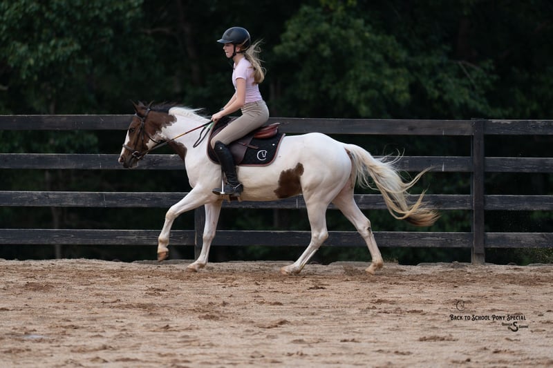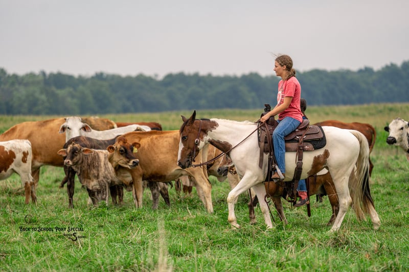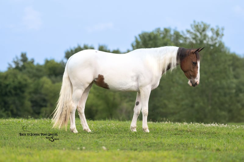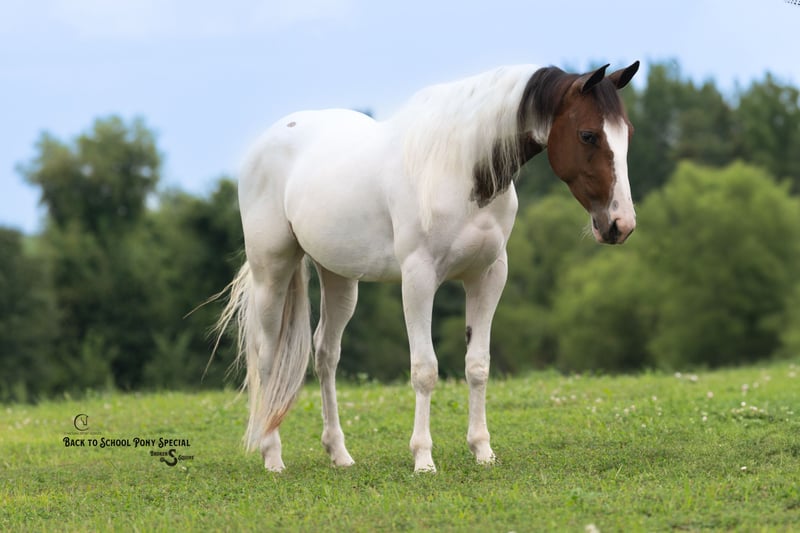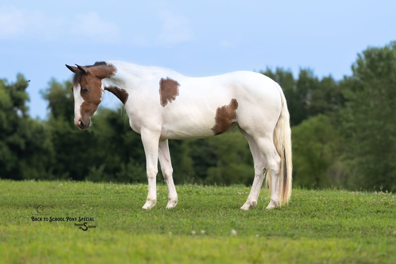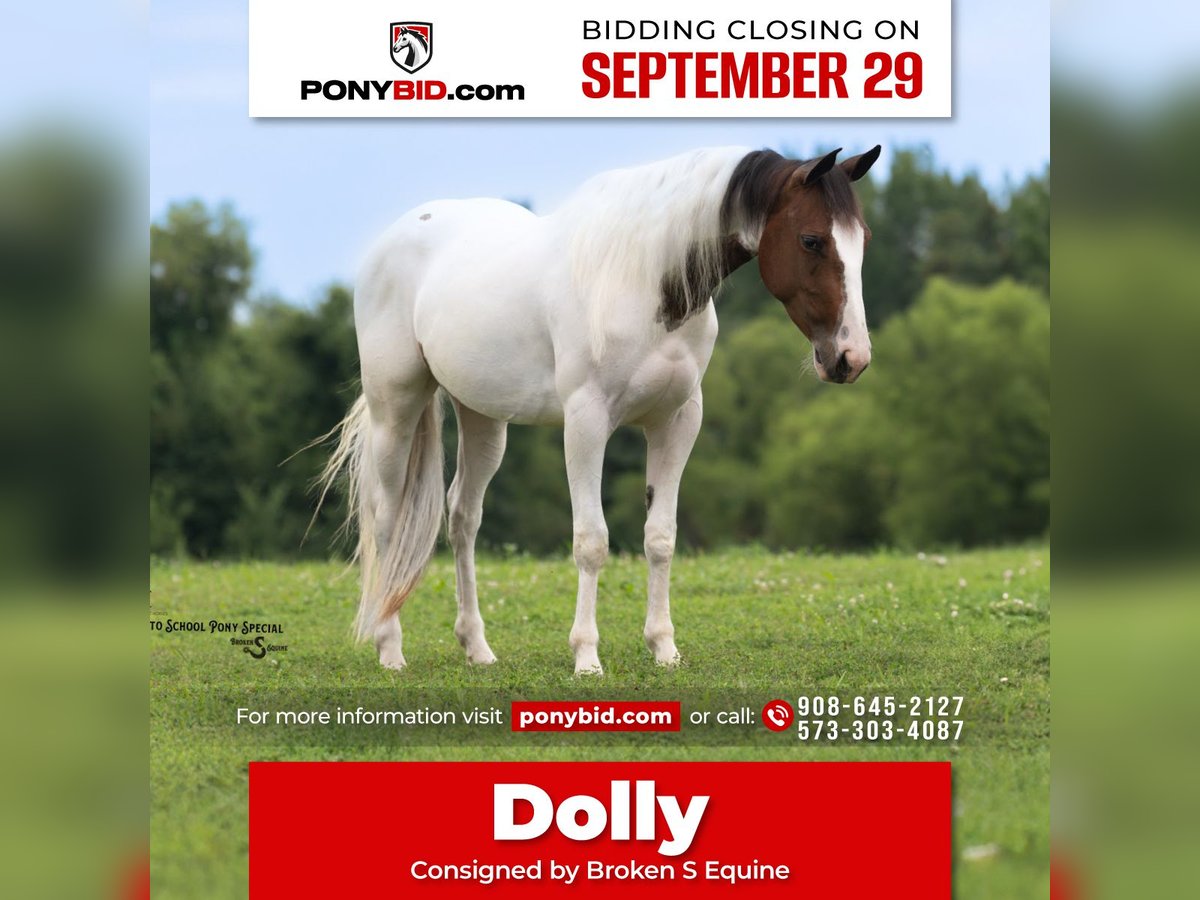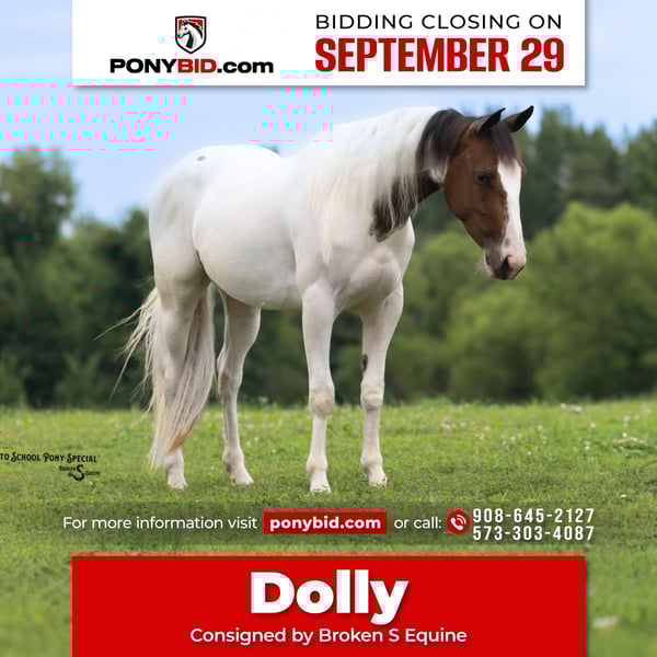 🐴 𝒕𝒉𝒆 𝐅𝐀𝐋𝐋 ℙ𝕆ℕ𝕐 𝑺𝒑𝒆𝒄𝒕𝒂𝒄𝒖𝒍𝒂𝒓🐴 Happening now thru MONDAY | SEPTEMBER 29th - Available EXCLUSIVELY on Ponybid's website! For more details and to register visit: www.Ponybid.com CONSIGNOR CONTACT: Broken S Equine Kieran 908-645-2127 or Beau 573-303-4087 LOCATION: Bogard, MO BREED: Paint REGISTERED: No COLOR: Paint HEIGHT: 13.3 AGE: 4 GENDER: Mare Dolly is a 4 year old paint mare standing 13.3 hands high. She has the moves and talent to shine in the show ring, and the quiet nature for absolutely anyone to enjoy. Talk about an unflappable horse, Dolly will stand still as a statue with bull whips being cracked, fireworks, and gunshots. She was born with a quiet mind, always being a slow and steady type. She’s ridden out with cows, gone cross country, enjoyed hunter paces, and of course has trail ridden on all over the countryside. She’s big enough in the body for adults, and gentle for the smallest riders too! Whether you want a future partner for the show ring, or a gentle and safe horse that anyone can take out on the trails today, Dolly is your girl! In the ring, Dolly has three comfortable and steady gaits. She picks up both leads, has a nice stop, and is easy for anyone. This mare is so gentle, we trust can trust her with anyone. Going off property to school in new, spooky, places was a breeze with her. She doesn’t get worked up a bit, and treats every new place like it’s home. On the trails, Dolly is steady and relaxed. She loves trail riding and hacking out. The kids can safely take her out alone, and she’s happy to go wherever you point her. She is safe in traffic, will cross water, and is the same quiet horse on any terrain. In the barn, Dolly is sweet and kind. She loves attention! She’s polite, yet affectionate, and gets along well with her people. She lives outside in a mixed herd of mates and geldings, and is an easy keeper with no vices or maintenance. Clean recent vet check on file