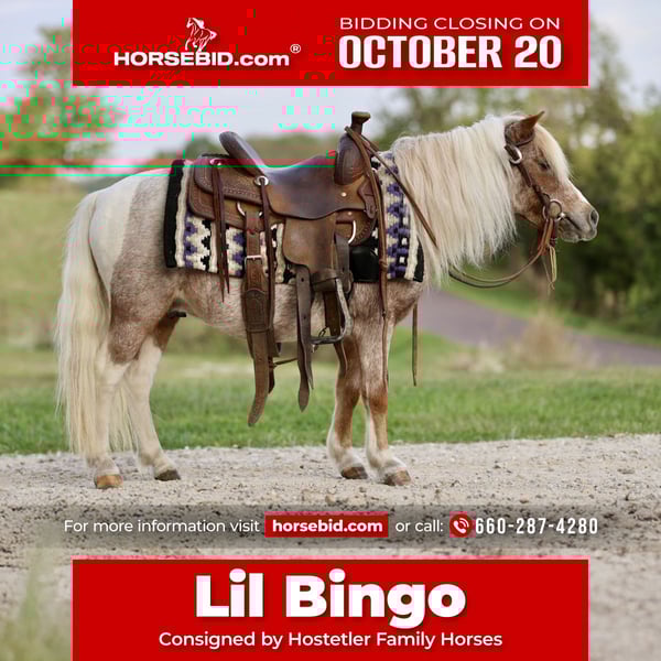 ♦️ 𝐭𝐡𝐞 𝐀𝐌𝐄𝐑𝐈𝐂𝐀𝐍 𝓕𝓪𝓵𝓵 𝓒𝓵𝓪𝓼𝓼𝓲𝓬 ♦️ Happening now thru MONDAY | OCTOBER 20th - Available EXCLUSIVELY on HorseBid's website! For more details and to register visit: www.Horsebid.com CONSIGNOR CONTACT: Hostetler Family Horses 660-287-4280 LOCATION: Sedalia Missouri BREED: Pony REGISTERED: No REGISTERED NAME: Lil Bingo COLOR: Red Roan Paint HEIGHT: 35 AGE: 10 GENDER: Gelding Wow!! Bingo is a 10 yr old miniature pony that stands approximately 35" tall and is as broke and gentle as you could ask to have one. He has that gorgeous red roan color and is beautifully put together like a little Quarter horse. If you're looking for a kid safe and grandmother approved little pony for your little tots, I invite you to check out Bingo. Bingo will go just about anywhere you point him and is a great confidence builder for those timid little kids that aren't as used to being around horses. He loves being groomed and loved on. If you have a kid or grandkid that would like to have a little partner to lead around and then get on and ride when they get tired of walking, bingo is probably your guy. He is used to having cousins and neighbor kids come over to learn how to ride on him. Bingo will go as slow as you need him to with the little kids but can also step it up a bit and lope around and do small jumps if the bigger kids want to play with him. He is willing to pull lighter loads from the horn but is also willing to go to work and pull the big kids and Grandpa and grandma around in the pony cart. You can even take him to town to shop if you wish, but he may require you to go through the Dairy Queen drive thru for an oreo/reeces blizzard for a treat. We really enjoy Bingo a lot and think you will too so if you are interested or want to come check him out in person on our farm, please feel free to call or text Russ @ 660-287-4280