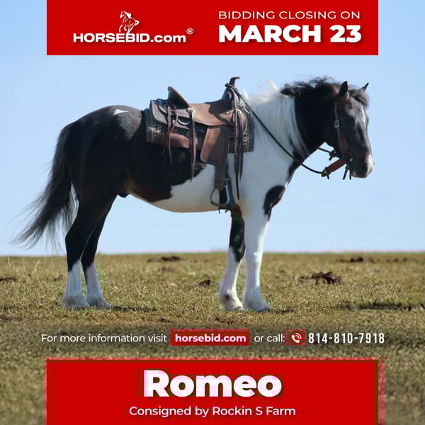 ⚜️𝓽𝓱𝓮 𝐆𝐎𝐋𝐃 𝓢𝓮𝓵𝓮𝓬𝓽⚜️ Happening now thru MONDAY | MARCH 23rd - Available EXCLUSIVELY on HorseBid's website! For more details and to register visit: www.Horsebid.com CONSIGNOR CONTACT: Rockin S Farm 814-810-7918 LOCATION: Rebersburg, PA BREED: Pony REGISTERED: No COLOR: Black and white paint HEIGHT: 44" / 11 hands AGE: 4 GENDER: Gelding 💥💥Romeo 💥💥 Here's a gorgeous babysitter pony gelding that is very well mannered and easy to get along with, he's 4yrs old with the mentality of a much older pony , Romeo is a saint on trails and goes wherever you point him through the brush over logs or through the water, he will trail ride alone or with other horses and has no problem keeping up with daddy's big horse even in the rough country Romeo is also very well trained to drive and has been out on the main highway and doesn't pay attention to any of the traffic, he has spent the last year taking the kids to school and will patiently stand tied all day , he's the kind the no matter what the children decide to do with him you know Romeo will take care of them Romeo has also been ridden alot around the farm from checking fences and working around the cattle he gives his best no matter what and loves to please, he's learns new things quickly and has been a favorite for the children. He also rides great in the arena and has a Smooth walk-trot-canter and lopes nice circles, so if you are looking for a gorgeous and beginner friendly personality of a pony be sure to check out this guy, he sells 100% sound , he is healthy and requires no maintenance he's never been foundered, If You have any questions please feel free to call Sam 814-810-7918 and we'd be happy to answer any questions you may have Also we're happy to assist in arranging transportation anywhere in the US