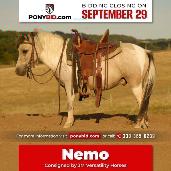 🐴 𝒕𝒉𝒆 𝐅𝐀𝐋𝐋 ℙ𝕆ℕ𝕐 𝑺𝒑𝒆𝒄𝒕𝒂𝒄𝒖𝒍𝒂𝒓🐴 Happening now thru MONDAY | SEPTEMBER 29th - Available EXCLUSIVELY on Ponybid's website! For more details and to register visit: www.Ponybid.com CONSIGNOR CONTACT: JM Versatility Horses 330-365-0239 LOCATION: Fresno, OH BREED: Miniature REGISTERED: No COLOR: Buckskin Paint HEIGHT: 38" AGE: 4 GENDER: Gelding Nemo is a 4 year old buckskin gelding standing 38 inches tall. This is a mini ranch pony deluxe! He has all the brains of a big horse in a little tiny body. He rides out on the ranch, lets the kids ride around the cows on him, and keeps his little riders safe. Our kids have taken him to the park. Hitch him up and drive him anywhere!Nemo is as wide as he is tall, making him a sturdy choice for any little cowboy or cowgirl. Nemo will ride in the arena and out, and is great on the lead line. He is a trail master, crossing water, logs, and busy roads with ease. He is sure footed and brave! Nemo will also do trail obstacle courses. In the barn,Nemo stands tied patiently and has great ground manners. He enjoys attention, being bathed, groomed, and braided. He’s used to dogs, and of course all of the crazy kids running about! He lives outside in a mixed herd and is the easiest of keepers. Located in Millersburg Ohio… Contact Jackson @ 330-275-2792