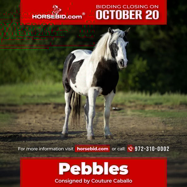 ♦️ 𝐭𝐡𝐞 𝐀𝐌𝐄𝐑𝐈𝐂𝐀𝐍 𝓕𝓪𝓵𝓵 𝓒𝓵𝓪𝓼𝓼𝓲𝓬 ♦️ Happening now thru MONDAY | OCTOBER 20th - Available EXCLUSIVELY on HorseBid's website! For more details and to register visit: www.Horsebid.com CONSIGNOR CONTACT: Couture Caballo 972-310-0002 LOCATION: Gainesville, TX BREED: Paint Pony REGISTERED: No COLOR: Black & White Overo Paint HEIGHT: TBD AGE: 7 GENDER: Gelding All Pebbles, No Bam Bam. 9 Year Old Black & White Paint Pony Gelding Standing at 10.3h (43.5 inches) and built like a miniature ranch horse, Pebbles is that rare little gelding who is safe, stylish, and FULL of character! The kids can run out in the pasture, pick up his feet, flop all over him, and he doesn’t care a bit. He’s the kind that meets you at the gate, not the kind you have to chase. Yes, they actually exist. Comfortable and uncomplicated, Pebbles walks, trots, lopes, stops, backs up, and works a gate. He rides inside or outside the arena, loads with ease, and stands tied like a pro. He’s sound, he brings the action with no buck or funny business. This little dude is the perfect step up pony for a kiddo who’s ready for something a little more fun without upgrading all the way to a big horse…. and a big climb! With a nice uphill canter and smooth, correct movement, he’d make an adorable English pony as easily as he fits in the ranch pen. Big enough for an adult to hop on, and kind enough for a kid to enjoy, Pebbles is a true companion — the kind of pony every barn needs and every family falls in love with. Sells sound with a current vet statement Offered by Couture Caballo — this is one pony that’s all Pebbles, no Bam Bam.
