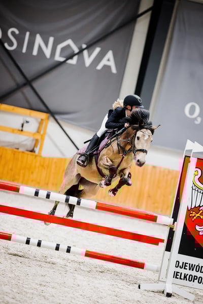 Super pony for sale, group C! Unfortunately, the time has come for us – as the child grows, the pony does not. Height: 140 cm, age: 6 years. Color: bay. Breed: riding pony. Young but very hardworking pony, loves to jump, very brave; even if the take-off doesn't suit him, he will always attempt the jump, and additionally, he dislikes touching the poles, which is a significant advantage of this pony. Regularly competing in national competitions in group C. Competing at heights of 100 cm is not a problem for him. He finished his first serious competition, the Indoor Polish Cup 2025, in 10th place. Healthy, in regular show jumping training. Eye-catching. Capes during riding and other children's ideas :) do not pose any problems for him. He performs better in precision and speed competitions than in style, as he occasionally crosses his legs. Pony available for viewing near Olsztyn - Warmian-Masurian Voivodeship.