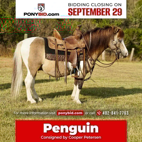 🐴 𝒕𝒉𝒆 𝐅𝐀𝐋𝐋 ℙ𝕆ℕ𝕐 𝑺𝒑𝒆𝒄𝒕𝒂𝒄𝒖𝒍𝒂𝒓🐴 Happening now thru MONDAY | SEPTEMBER 29th - Available EXCLUSIVELY on Ponybid's website! For more details and to register visit: www.Ponybid.com CONSIGNOR CONTACT: Cooper Petersen 402-841-7763 LOCATION: Corsica, SD BREED: Pony REGISTERED: No COLOR: Buckskin paint HEIGHT: 33 inches AGE: 8 GENDER: Gelding Penguin is a super cute 33 inch eight-year-old buckskin paint Pony gelding. Penguin has been used for riding and driving and used at the fair for pony rides and in a petting zoo he is super cute and super gentle. He lays down on cue, he rides extremely well and is super easy and safe for all ages and levels of kids to ride and enjoy, he is good with other horses, easy keeper no maintenance can be on pasture or on hay, saddles, and bridles good, no bad habits loads, unloads, and hauls good, he is a super nice all-around pony that will make your child very happy.
