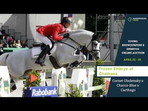 Whizz Kid power, with 1.70m Casquo Blue in the family With Cornet Obolensky as sire and Chathana (Chacco-Blue x Carthago) as dam, this frozen embryo is bred from a blend of proven top-level sire power and a damline packed with international performance. Cornet Obolensky has been one of the most influential showjumping sires in the world for years, celebrated for quality, reflexes and scope, traits that are further reinforced here by an exceptionally strong performance family on the dam’s side. Dam Chathana descends from the well-known mare Whizz Kid (Carthago x Grannus), a family that consistently produces international showjumpers generation after generation. This line includes the 1.70m performer Casquo Blue, the 1.60m jumper Chaganus, and multiple horses competing at 1.50–1.55m level, underlining the depth and reliability of performance throughout the family. This embryo therefore combines the commercial appeal of Cornet Obolensky with a damline where top sport is clearly present, close up and across multiple generations. A highly attractive opportunity for those looking to invest in a future sport and breeding prospect, backed by a proven foundation, strong names in the direct damline and a pedigree that remains both sport-oriented and commercially appealing.
