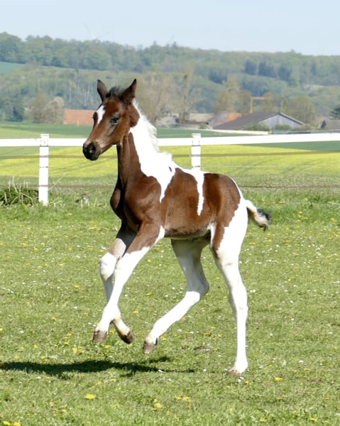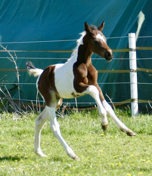 Invictus A präsentiert sich als ein außergewöhnliches Hengstfohlen, das durch seine Qualität und Ausstrahlung beeindruckt. In auffälliger Scheckfarbe gezogen, vereint er nicht nur optische Besonderheit, sondern vor allem eine erstklassige springbetonte Abstammung: Insider x Diamant de Semilly. Schon jetzt zeigt Invictus A eine bemerkenswerte Bewegungsstärke, gepaart mit sportlicher Elastizität und einem natürlichen Gleichgewicht. Seine Gänge sind kraftvoll, raumgreifend und stets von aktiver Hinterhand getragen – beste Voraussetzungen für eine erfolgreiche Karriere im Sport. Besonders hervorzuheben ist sein wacher, aufmerksamer Charakter. Invictus A überzeugt durch seine Neugier, Intelligenz und Lernbereitschaft, Eigenschaften, die ihn zu einem vielversprechenden Partner für ambitionierte Reiter machen. Mit seiner Kombination aus herausragender Genetik, athletischem Vermögen und positivem Interieur ist Invictus A ein echtes Nachwuchstalent – prädestiniert für den Springsport, aber ebenso interessant für die Vielseitigkeit. Ein Fohlen, das große Erwartungen weckt und das Potenzial für eine erfolgreiche Zukunft in sich trägt.