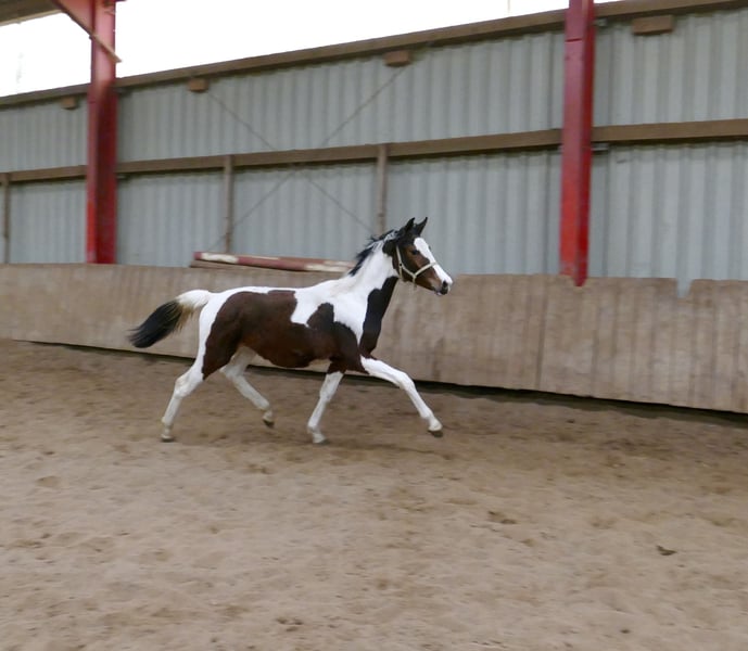 A very typy, pinto foal mare, Casey A, with a performance-oriented, international show jumping pedigree. On the sire's side, she descends from Cadiz (Cordess-Clinton x Heartbreaker x Shakespeare x Potsdam NRW), while on the dam's side, she is related through Zinedine (Guidam x Heartbreaker) and Ismo (Ilasso x First Gotthard x Zeus) – a proven international jumping lineage. The young mare exhibits strong, elastic movement and a lot of scope, making her well-suited for show jumping or eventing. In addition to her sporting potential, Casey A impresses with her balanced, people-oriented, and very pleasant temperament.