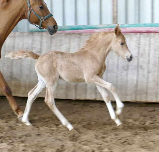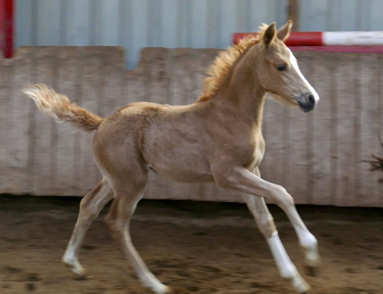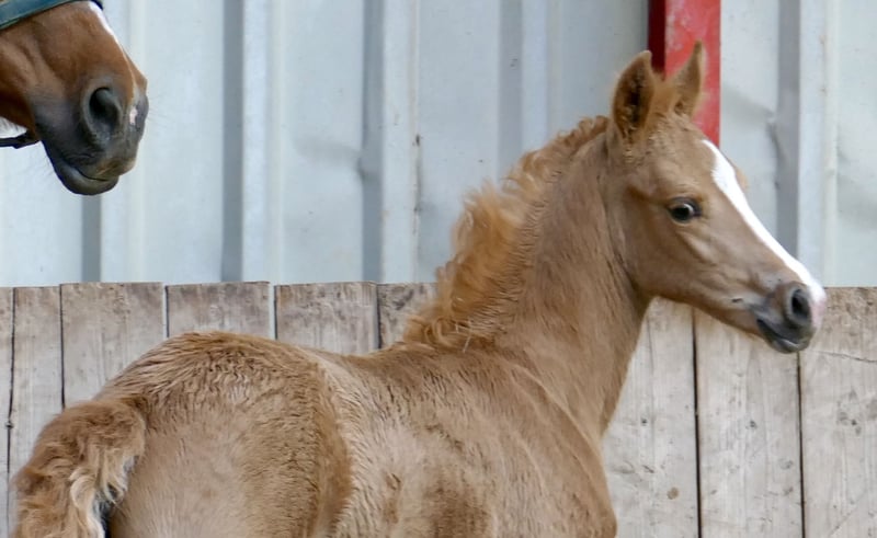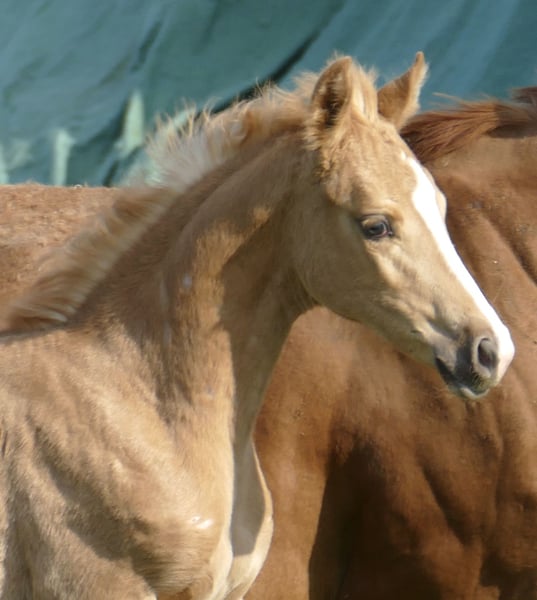 Superschickes Palominostutfohlen sucht noch ein neues Zuhause! Marylin Gold - Die Tochter von Michelangelo x Ismo verzaubert nicht nur mit ihrer goldenen Farbe, sondern auch mit beeindruckender Bewegungsqualität und viel natürlicher Athletik. Sie bringt alles mit, was man sich für eine spätere Karriere im Vielseitigkeits- oder Springsport wünscht.